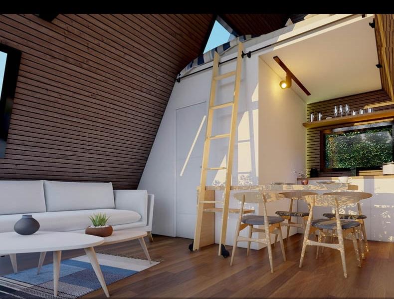 บ้านสำเร็จรูปทรงสามเหลี่ยมทันสมัยหรูหรา โครงสร้างเหล็กเบาผสมไม้ ใช้เป็นสำนักงาน ห้องครัว ห้องน้ำ โรงแรม ห้องนั่งเล่น ห้องนอน