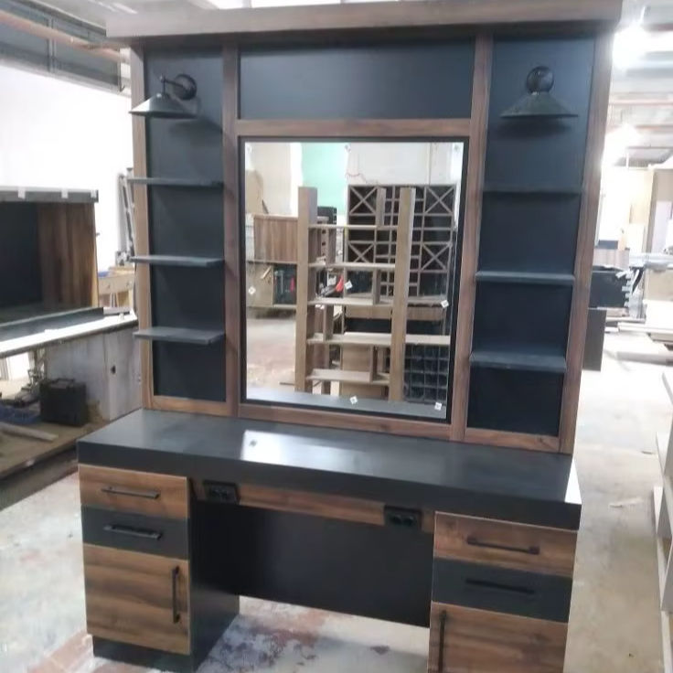 สถานีกระจกตัดผมไม้แท้สไตล์โมเดิร์นสุดหรู ทนทาน โครงสร้างโลหะ ปรับได้ เหมาะสำหรับร้านตัดผมเชิงพาณิชย์