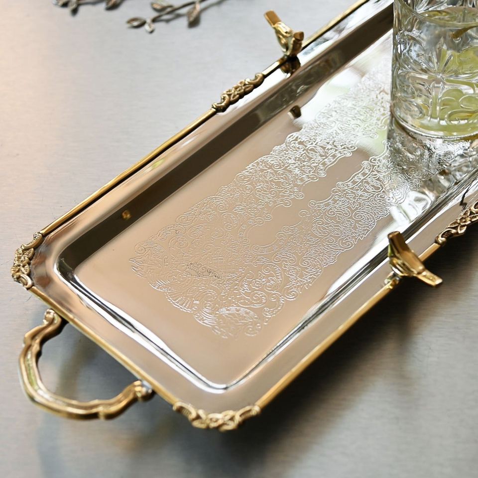 ถาดเสิร์ฟโลหะสีเงินทรงสี่เหลี่ยมผืนผ้า ดีไซน์หรูหราทันสมัย พร้อมช่องใส่ของด้านในและหูจับสีทอง เหมาะสำหรับตกแต่งบ้าน งานแต่งงาน งานวันเกิด และเทศกาลอีสเตอร์
