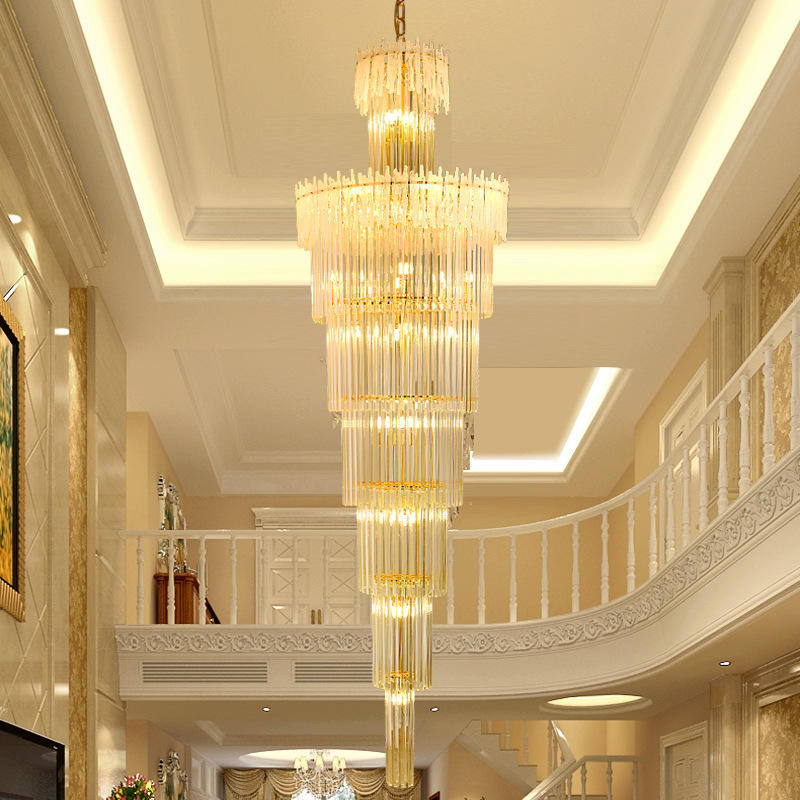 โคมไฟระย้าคริสตัลสีทองสไตล์โมเดิร์นหรูหราสำหรับวิลล่า โรงแรม ล็อบบี้ บันได แสงสีขาวอบอุ่น ใช้พลังงานไฟฟ้ากระแสสลับ
