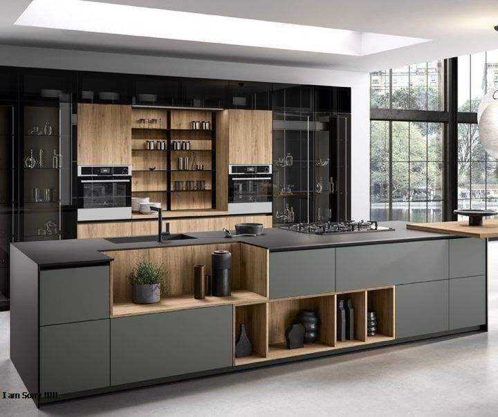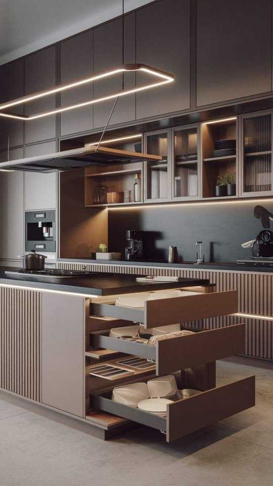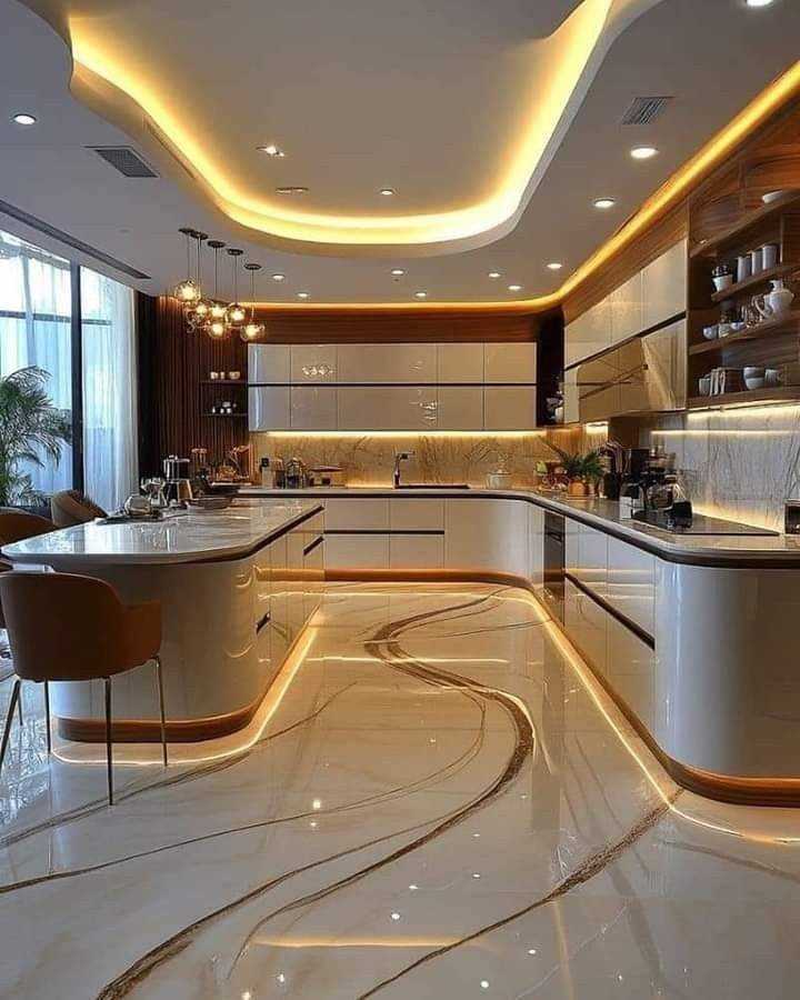 ครัวสำเร็จรูปหรูหราพร้อมเคาน์เตอร์แบบเกาะ ตู้ไม้เคลือบเงา เครื่องใช้ไฟฟ้าในตัว ที่เก็บของทันสมัย และตกแต่งภายในระดับพรีเมียม
