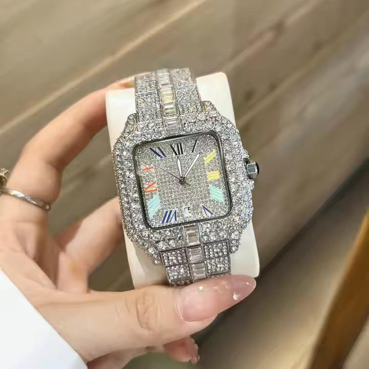 นาฬิกาเพชรโมอิสสีไนท์สุดหรูนาฬิกาควอทซ์สุดอินเทรนด์นาฬิกาทรงสี่เหลี่ยมดีไซน์เพชรสำหรับผู้ชายและผู้หญิง