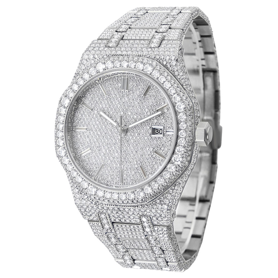 Luxury Moissanite Iced Out Watch Full Diamond Dial Silver Tone Bracelet Watch Hip Hop Style Sparkling Wristwatch