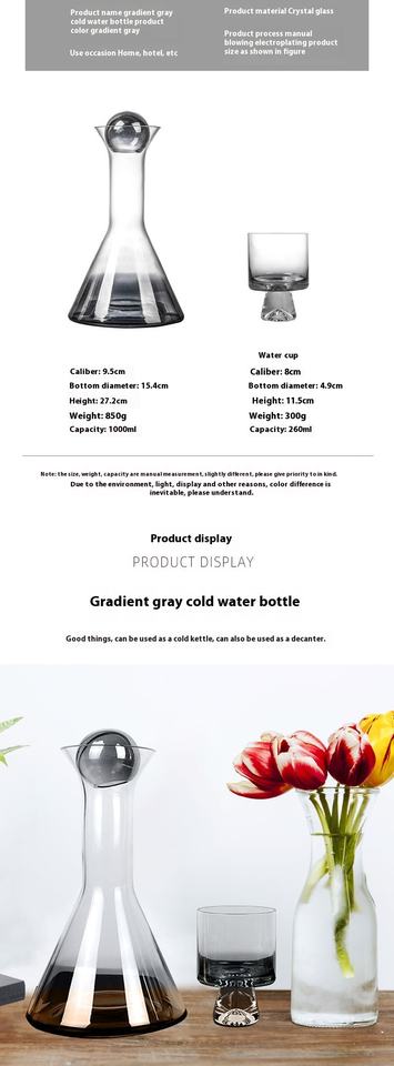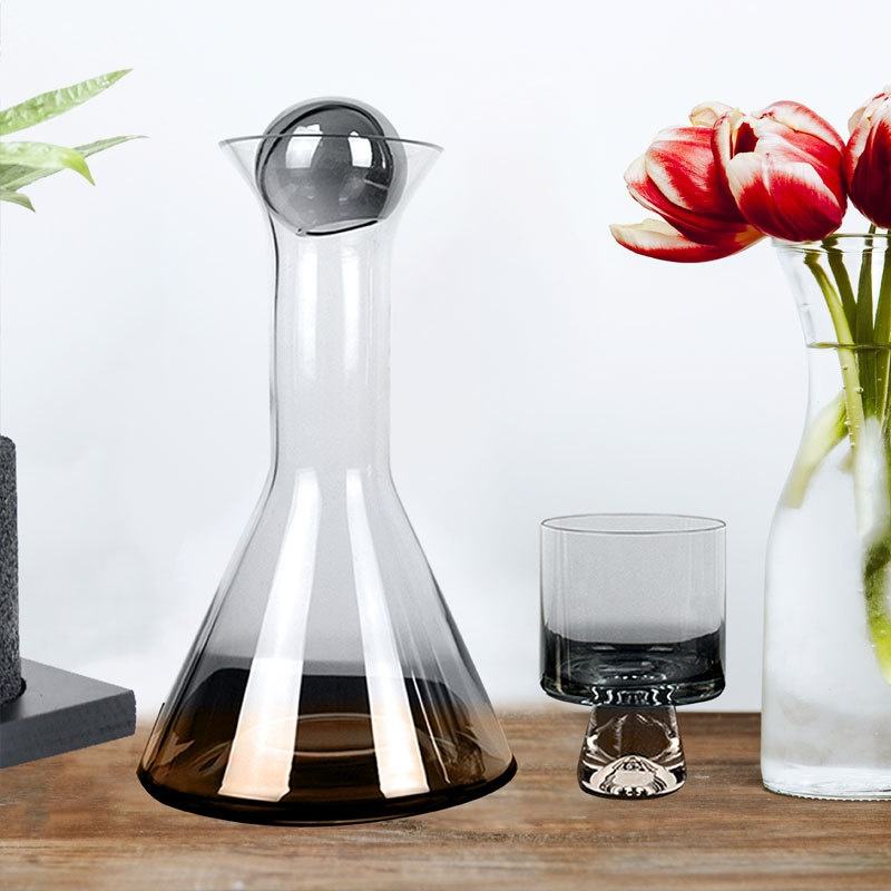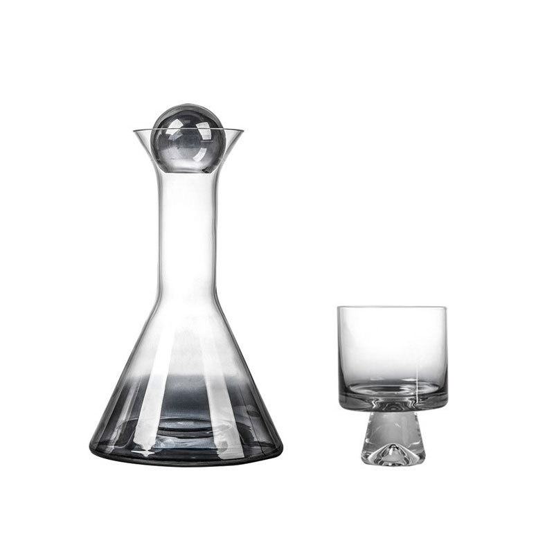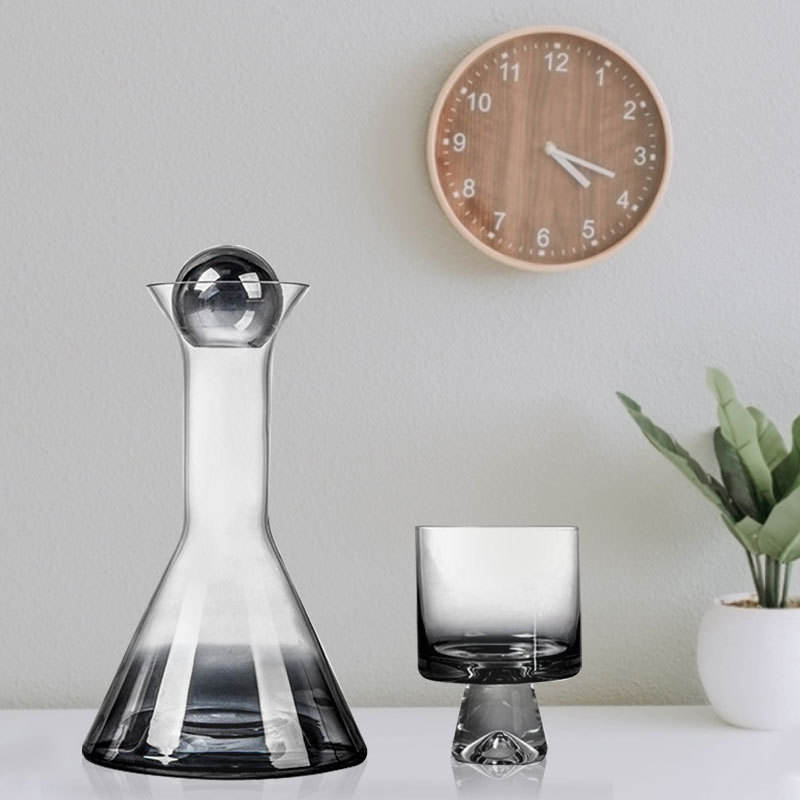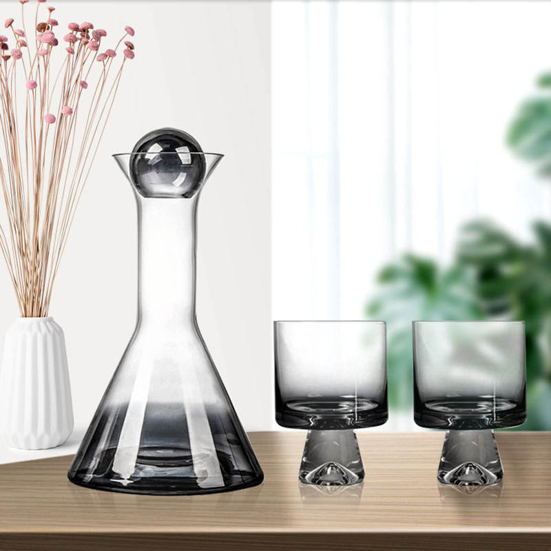 ชุดขวดเหล้าคริสตัลสีเทาควันสไตล์นอร์ดิกสุดหรู พร้อมแก้วฐานหนา 4 ใบ รูปทรงเรขาคณิต เหมาะสำหรับเป็นของขวัญสำหรับบาร์