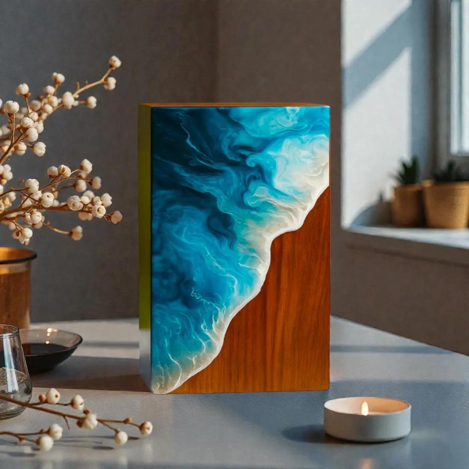 โกศเรซิ่นลายคลื่นทะเลสุดหรู งานแฮนด์เมดจากไม้และอีพ็อกซี่สีน้ำเงินเข้ม กล่องเก็บของที่ระลึก