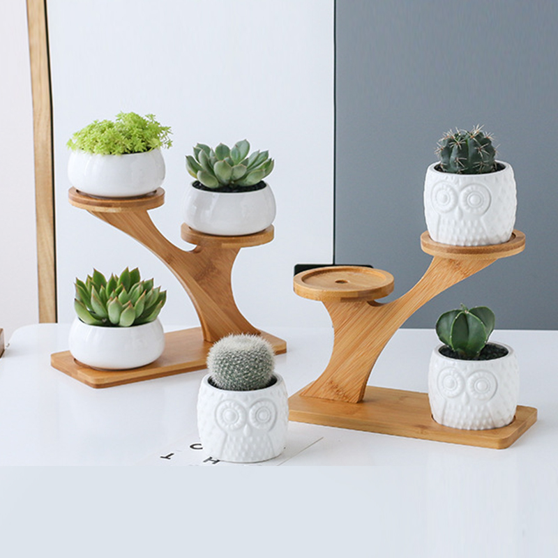 กระถางไม้ไผ่3ชั้นพร้อมชั้นวางไม้ไผ่หรูหรากระถางต้นไม้เซรามิกพร้อมชั้นไม้ไผ่