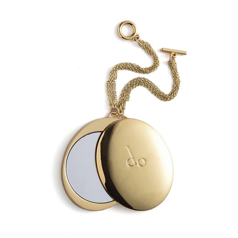 กระจกแต่งหน้าแบบพกพาทรงวงรีสองด้าน ดีไซน์หรูหรา พร้อมลายปั๊มนูนสีทอง หมุนได้ พร้อมสายคล้อง