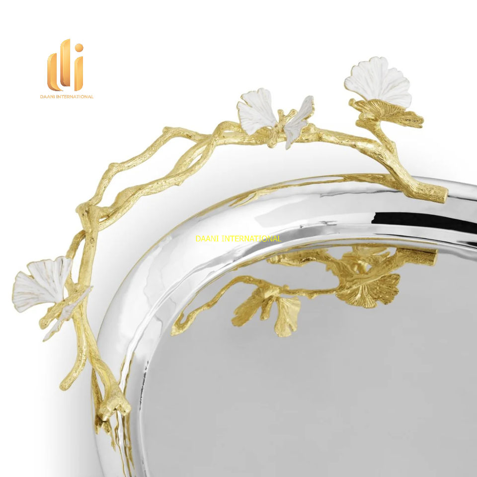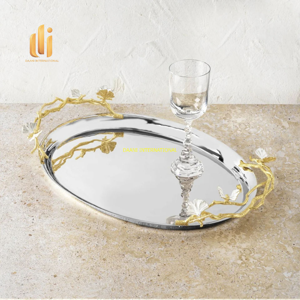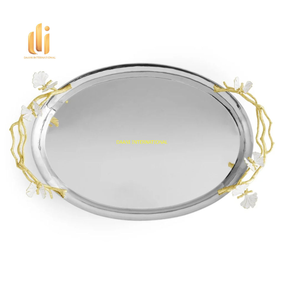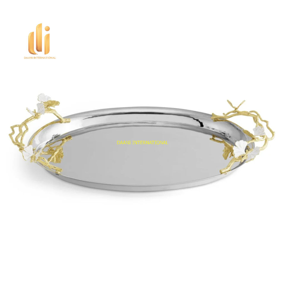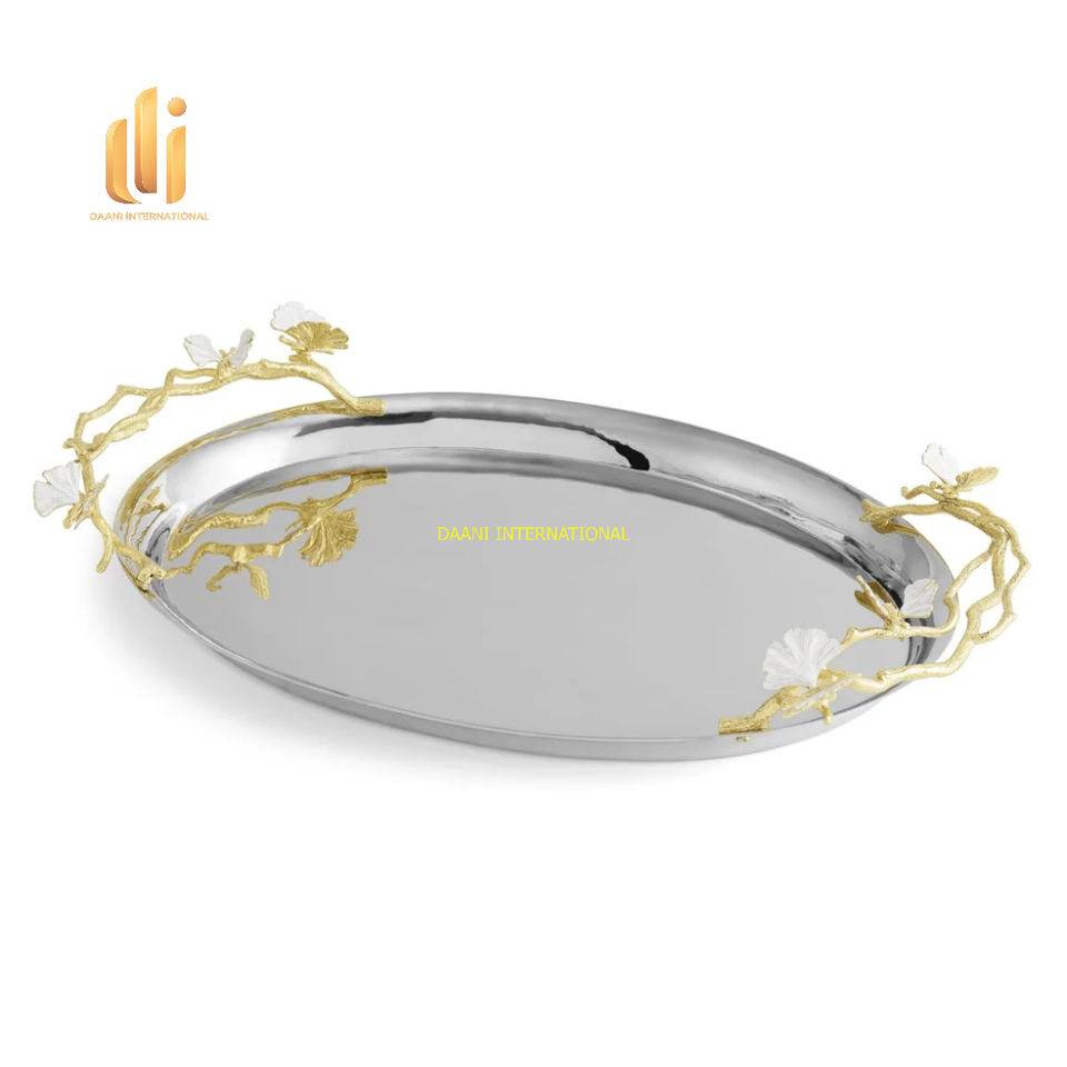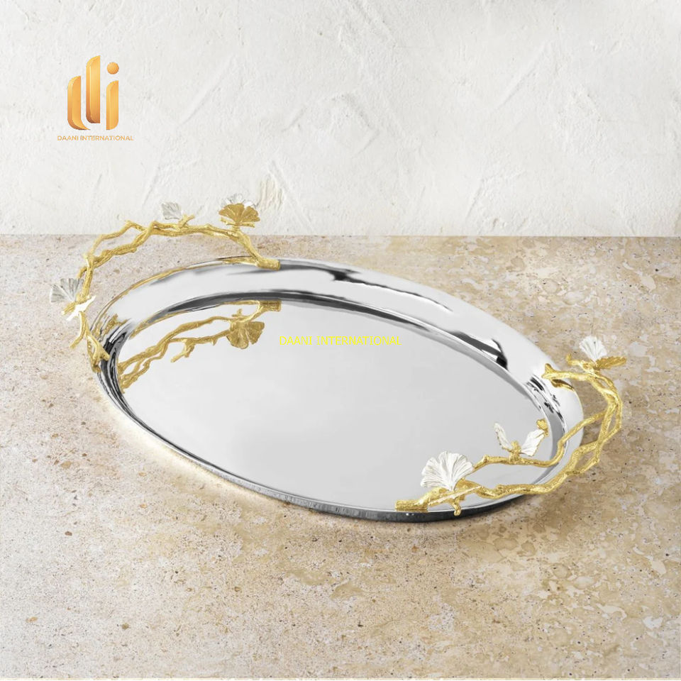 Luxury Oval Stainless Steel Decorative Serving Tray Golden Floral Branch Handles 100pcs for Wedding Buffet Dining Party Home