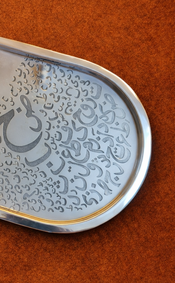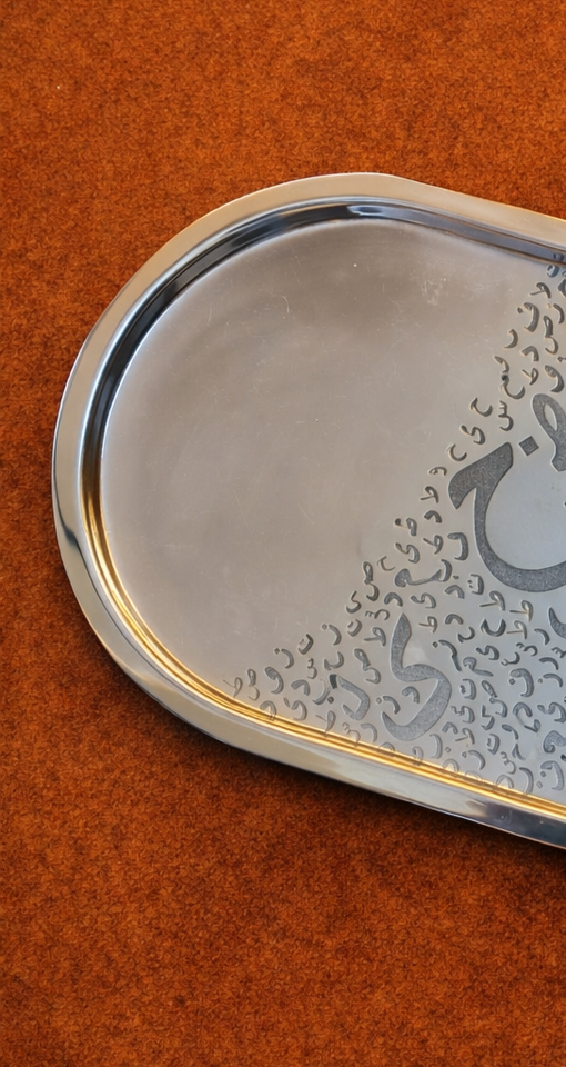 ถาดเสิร์ฟรูปวงรีสแตนเลสหรูหราพร้อมลายสลักอักษรอาหรับ จานเงินตกแต่งสำหรับของขวัญวันอีด รอมฎอน บุฟเฟ่ต์