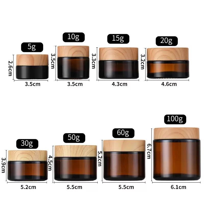 ขวดครีม PET หรูหรา ขนาด 0.17 ออนซ์ 0.5 ออนซ์ 1 ออนซ์ 2 ออนซ์ 3.5 ออนซ์ สีอำพัน ใส สำหรับเครื่องสำอาง ฝาเกลียวไม้ สีทอง สีเงิน สั่งทำสีได้