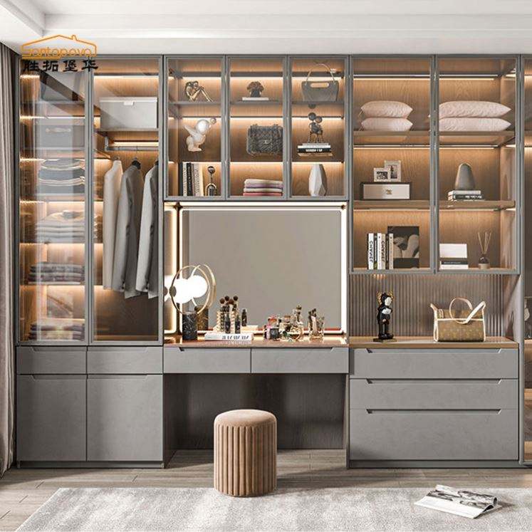 ตู้เสื้อผ้าไม้จริงแบบโมเดิร์นสั่งทำพิเศษสำหรับห้องนอนหรูหรา ตู้เสื้อผ้าแบบวอล์กอินสั่งทำ