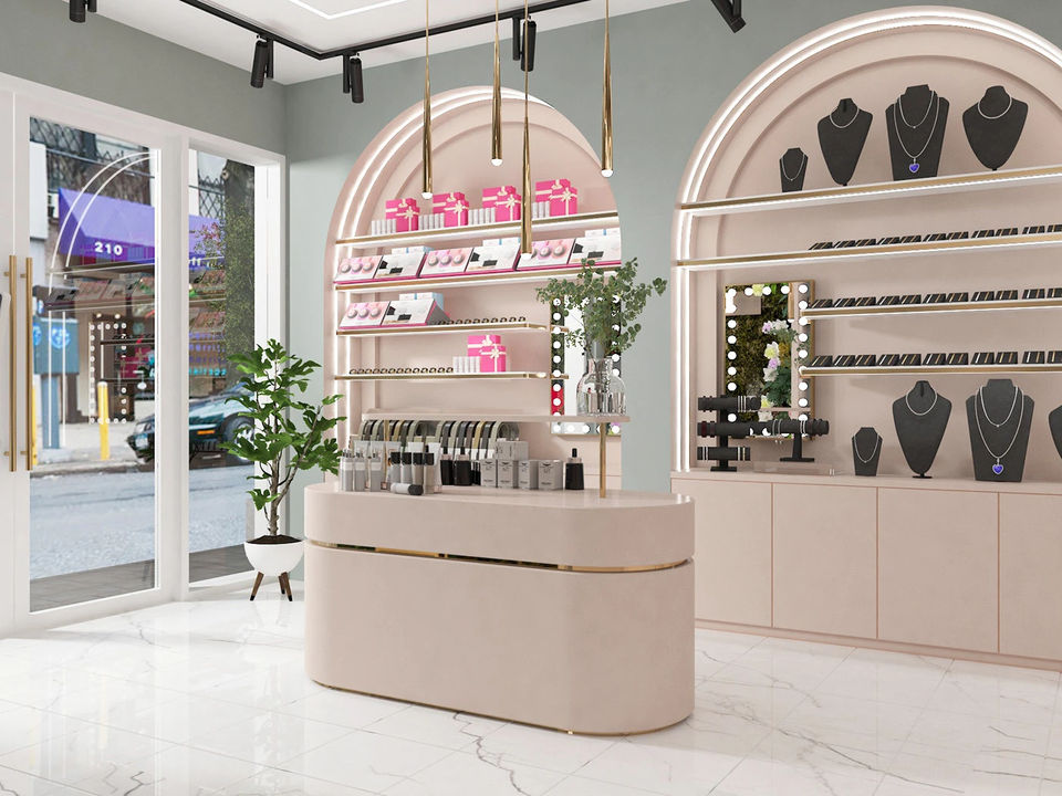 ตู้โชว์น้ำหอมสุดหรูตู้โชว์น้ำหอมสีทองแบบสั่งทำของตกแต่งร้านน้ำหอมเป็นมิตรกับสิ่งแวดล้อม