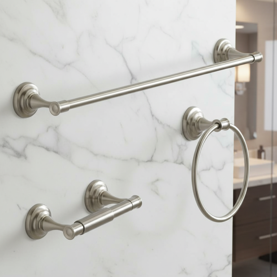 ชุดอุปกรณ์ห้องน้ำชุบนิกเกิลสุดหรู ที่วางกระดาษชำระ ราวแขวนผ้าเช็ดตัวแบบคลาสสิก และห่วงแขวนผ้าเช็ดตัว