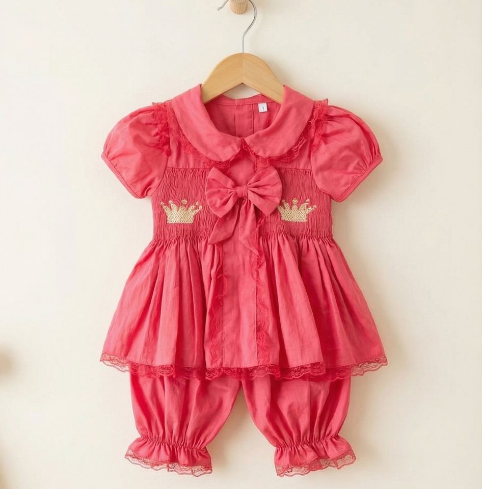 Luxury Princess Style Pink Hand Smocked Baby Girl Sleepwear with Gold Crown Embroidery Puff Sleeve Top and Bloomer Outfit