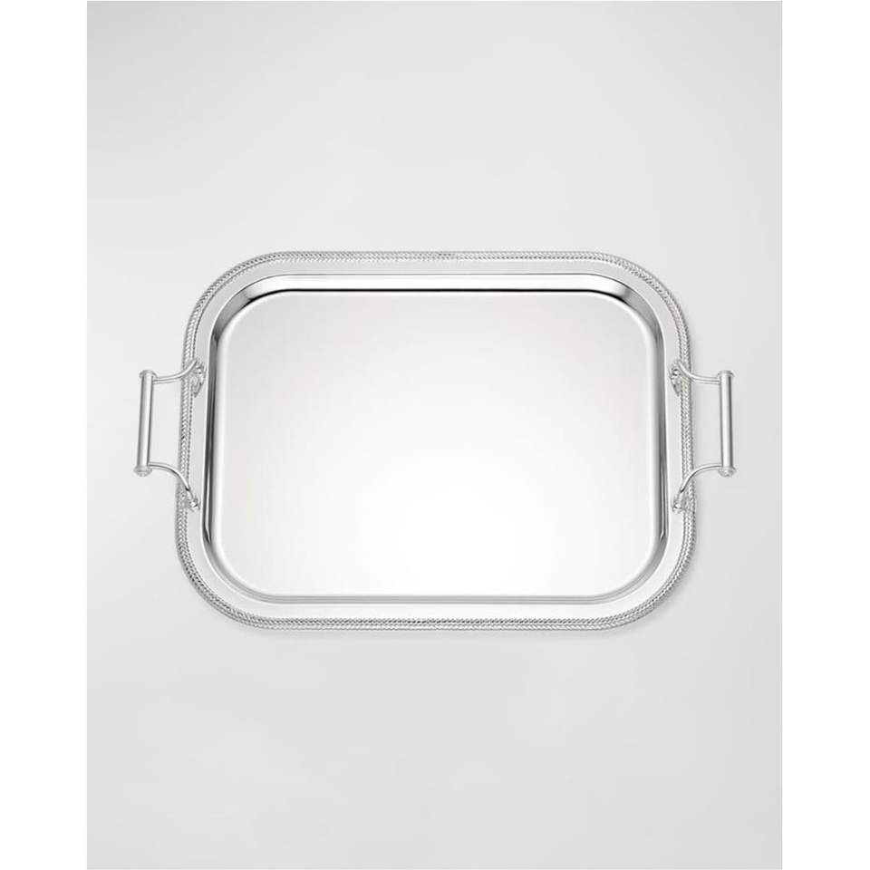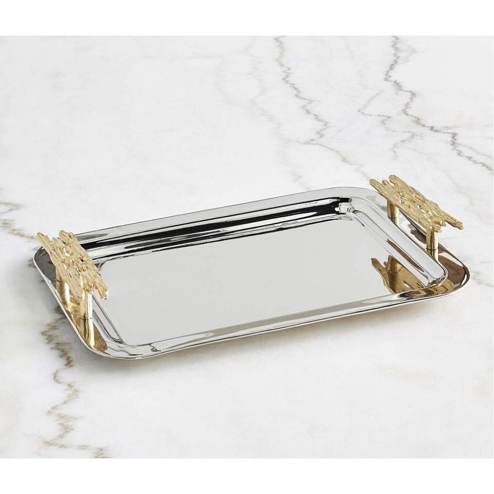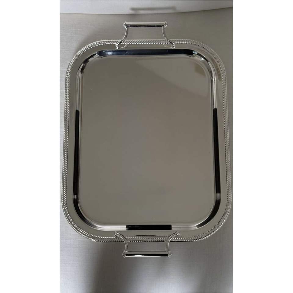 ถาดเสิร์ฟสแตนเลสทรงสี่เหลี่ยมหรูหรา พร้อมหูจับ ขอบตกแต่งผิวกระจก ถาดโลหะสำหรับโรงแรมและร้านอาหาร
