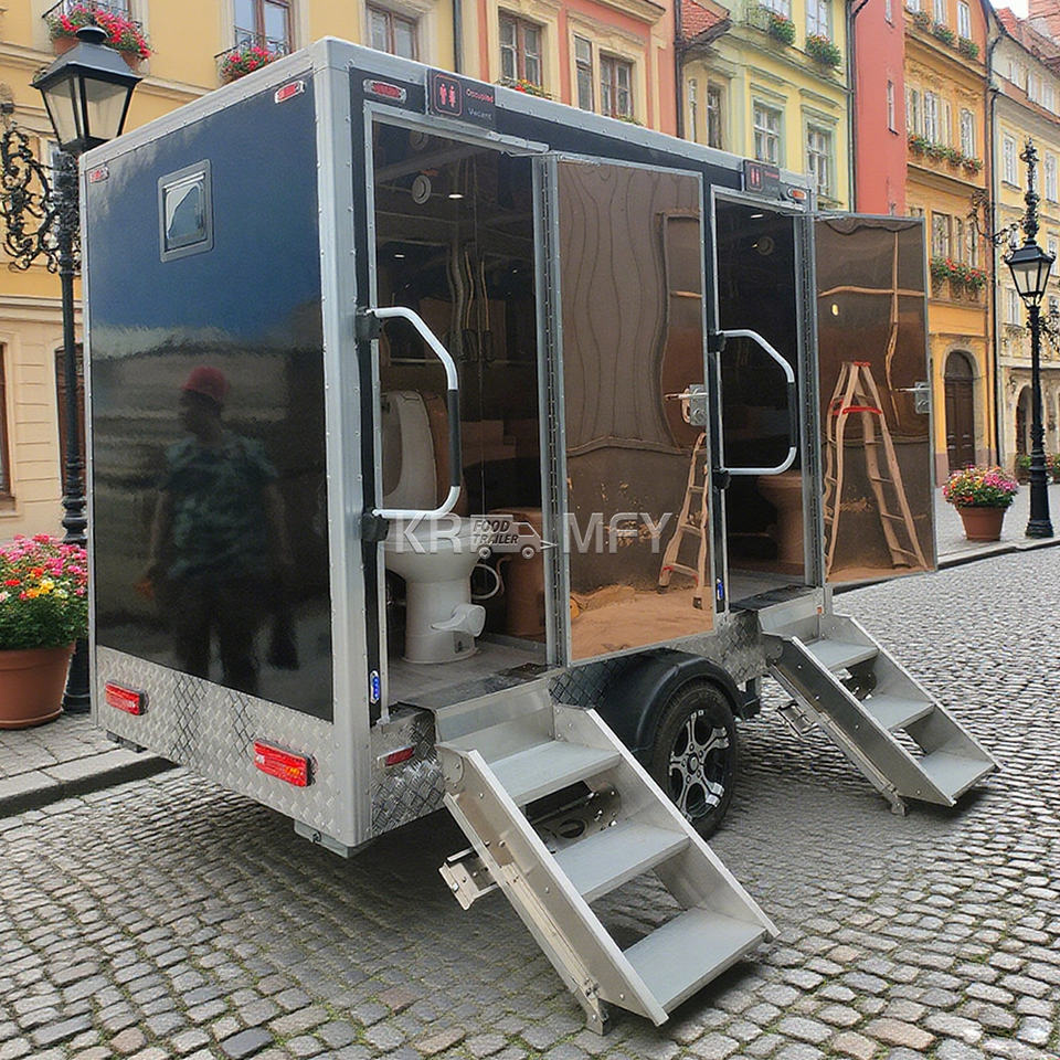 รถพ่วงห้องน้ำหรูหรา 2 ยูนิต สำหรับงานกลางแจ้ง ห้องอาบน้ำเคลื่อนที่ ห้องสุขาสำหรับตั้งแคมป์ พร้อมมือจับพับได้