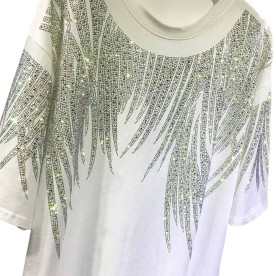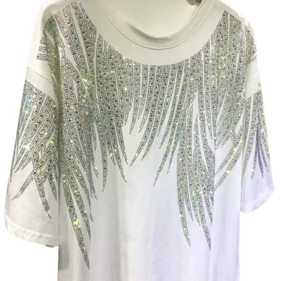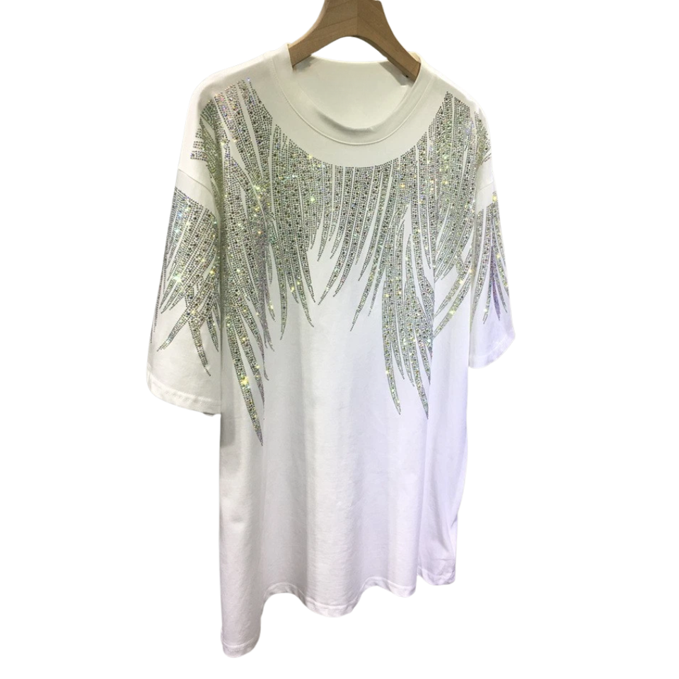 เสื้อยืดประดับพลอยเทียมสีขาวสุดหรูเสื้อยืดดีไซน์คริสตัลโอเวอร์ไซส์สำหรับทุกเพศโลโก้ผลิตตามสั่ง