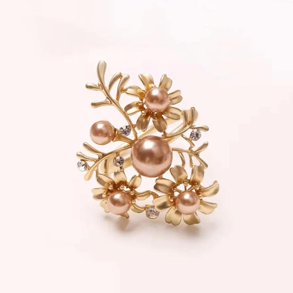 ที่ใส่ผ้าเช็ดปากรูปดอกไม้ประดับคริสตัลหรูหรา พร้อมไข่มุกเทียม ตกแต่งโต๊ะอาหารอย่างมีระดับด้วยกิ่งไม้สีทองและดอกไม้ประดับ