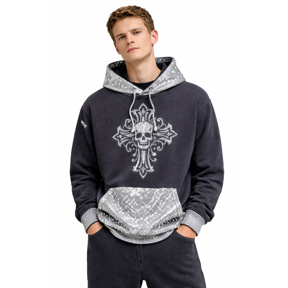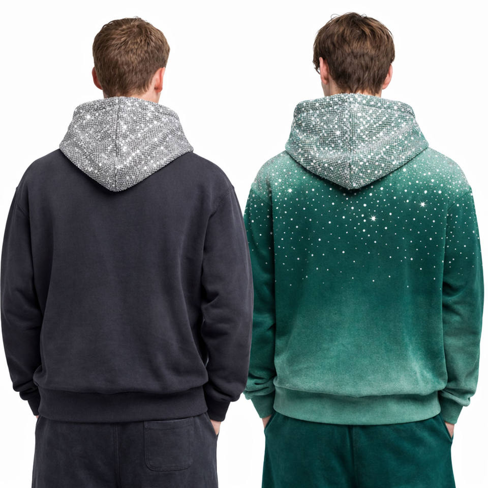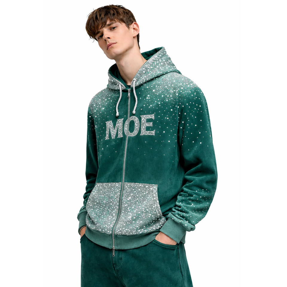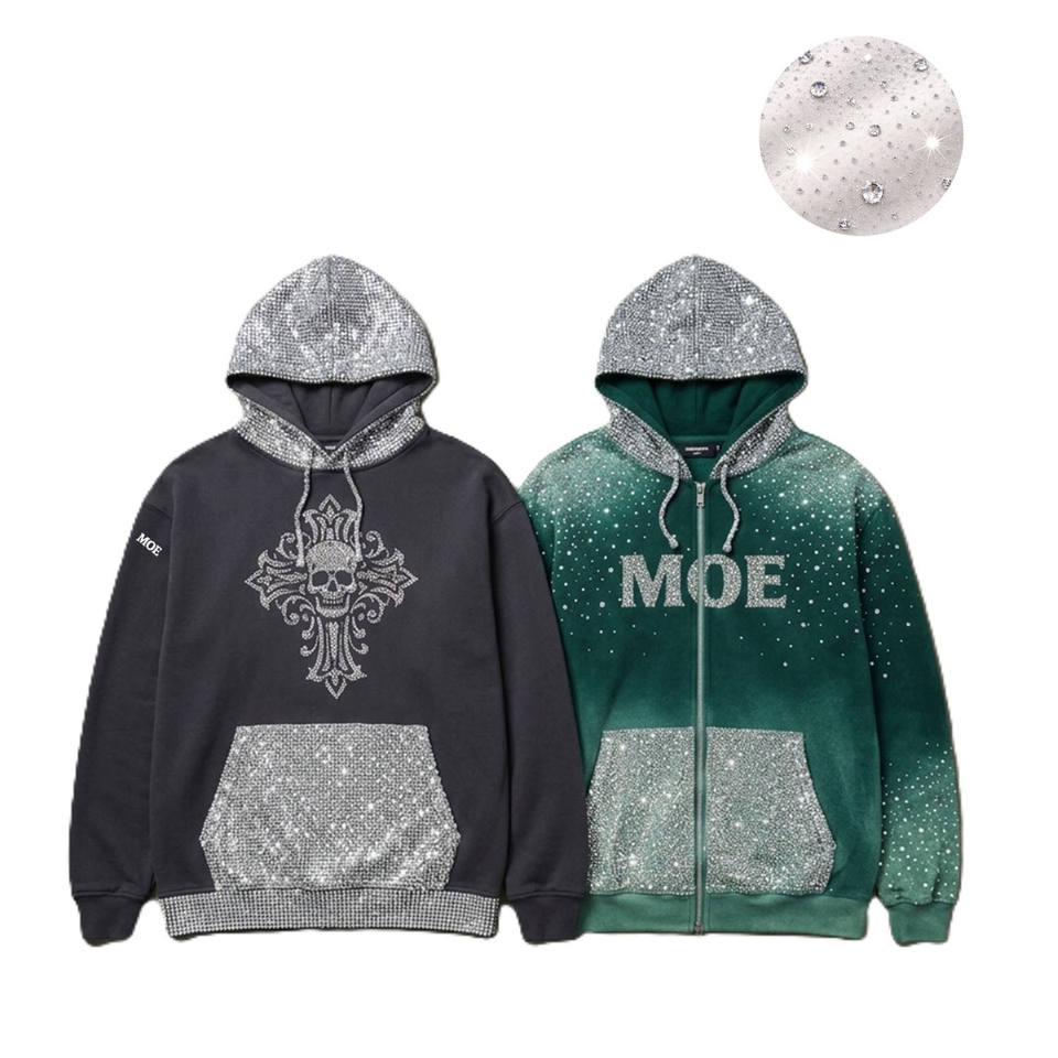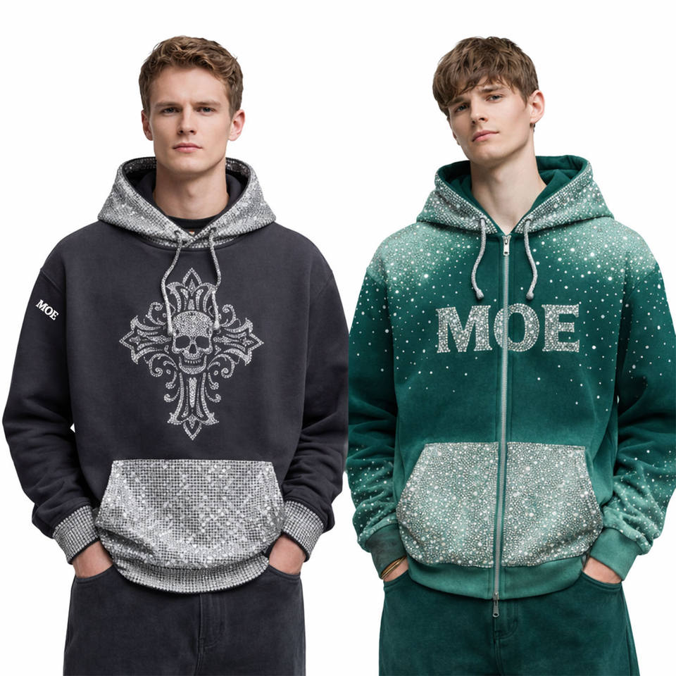 เสื้อฮู้ดซิปและแบบสวมหัวประดับเพชรหรูหราสำหรับผู้ชาย ทรงโอเวอร์ไซส์ สตรีทแวร์ ผ้าฝ้ายฟลีซไล่เฉดสีและลายกราฟิก สั่งทำจำนวนมากได้