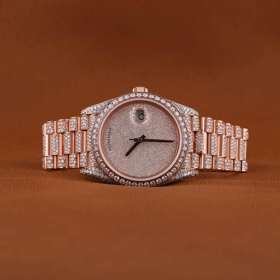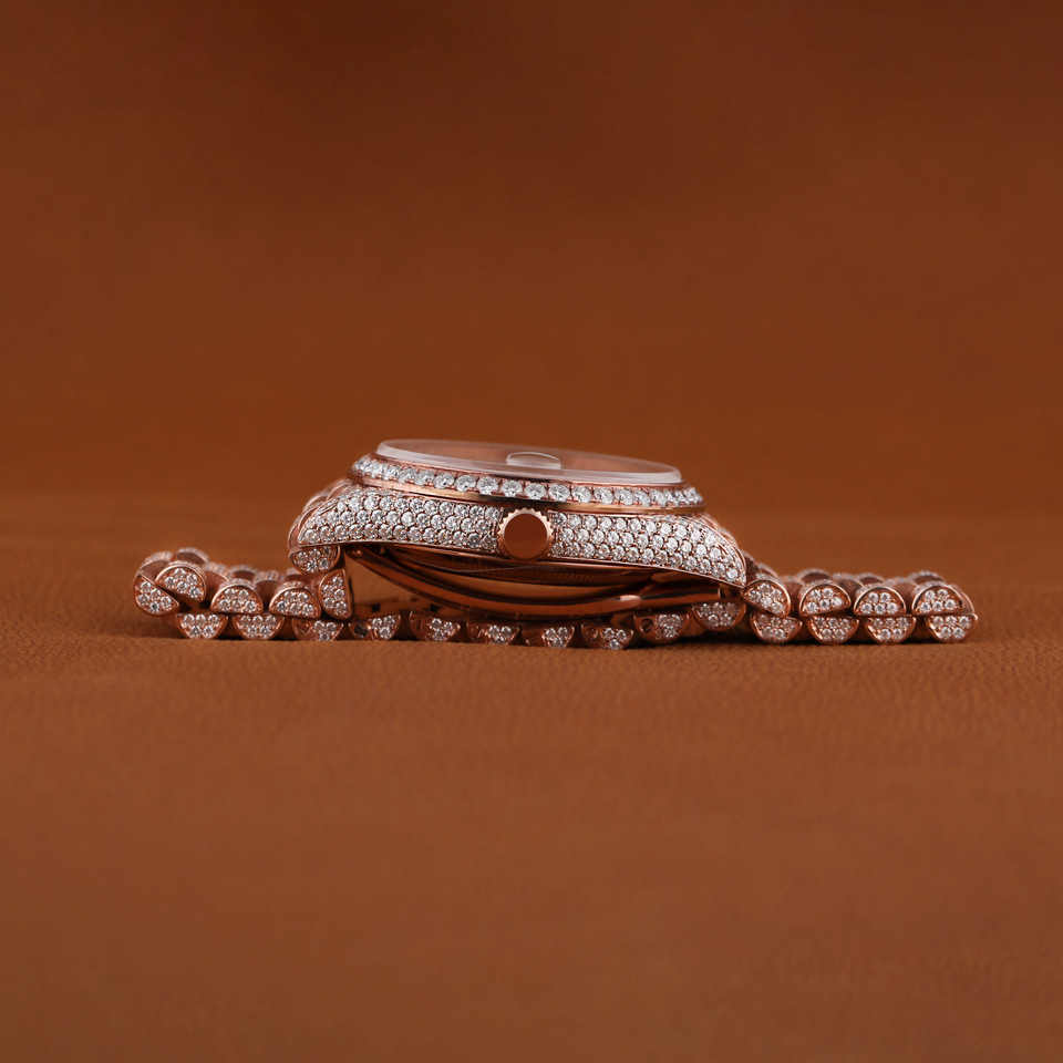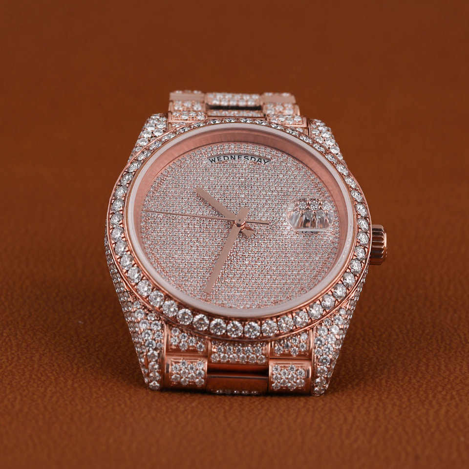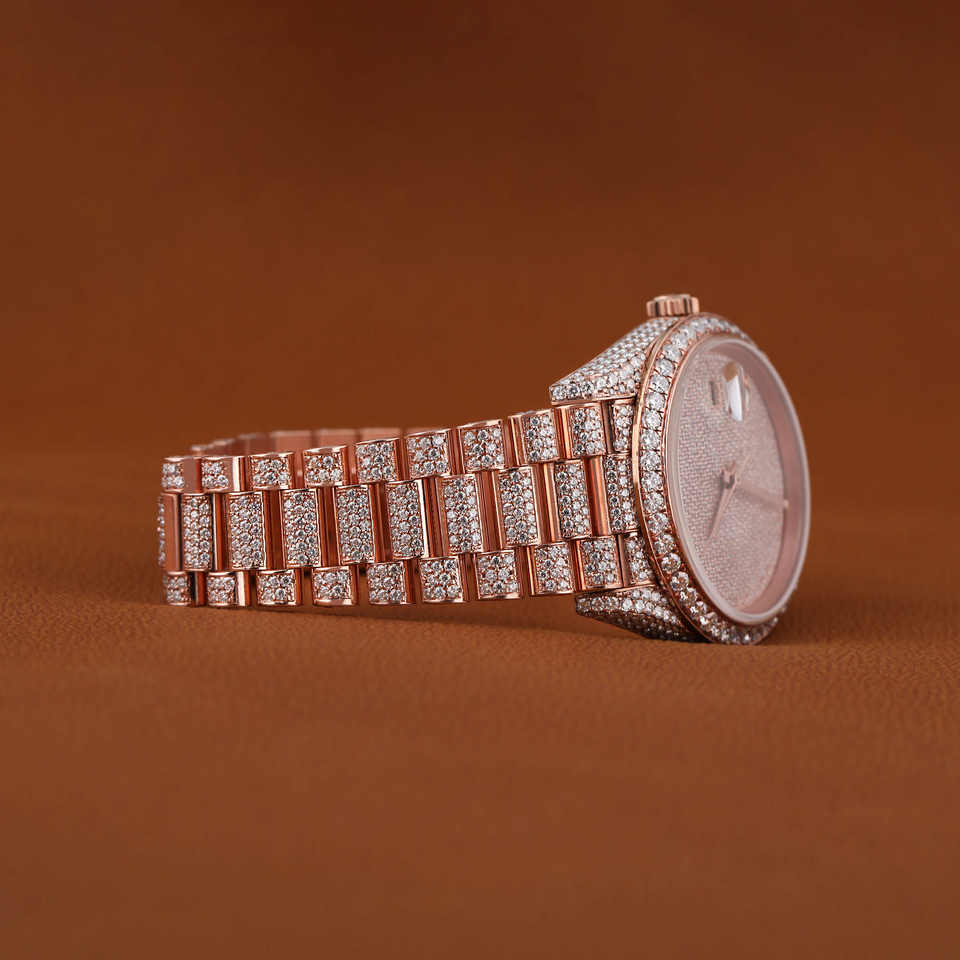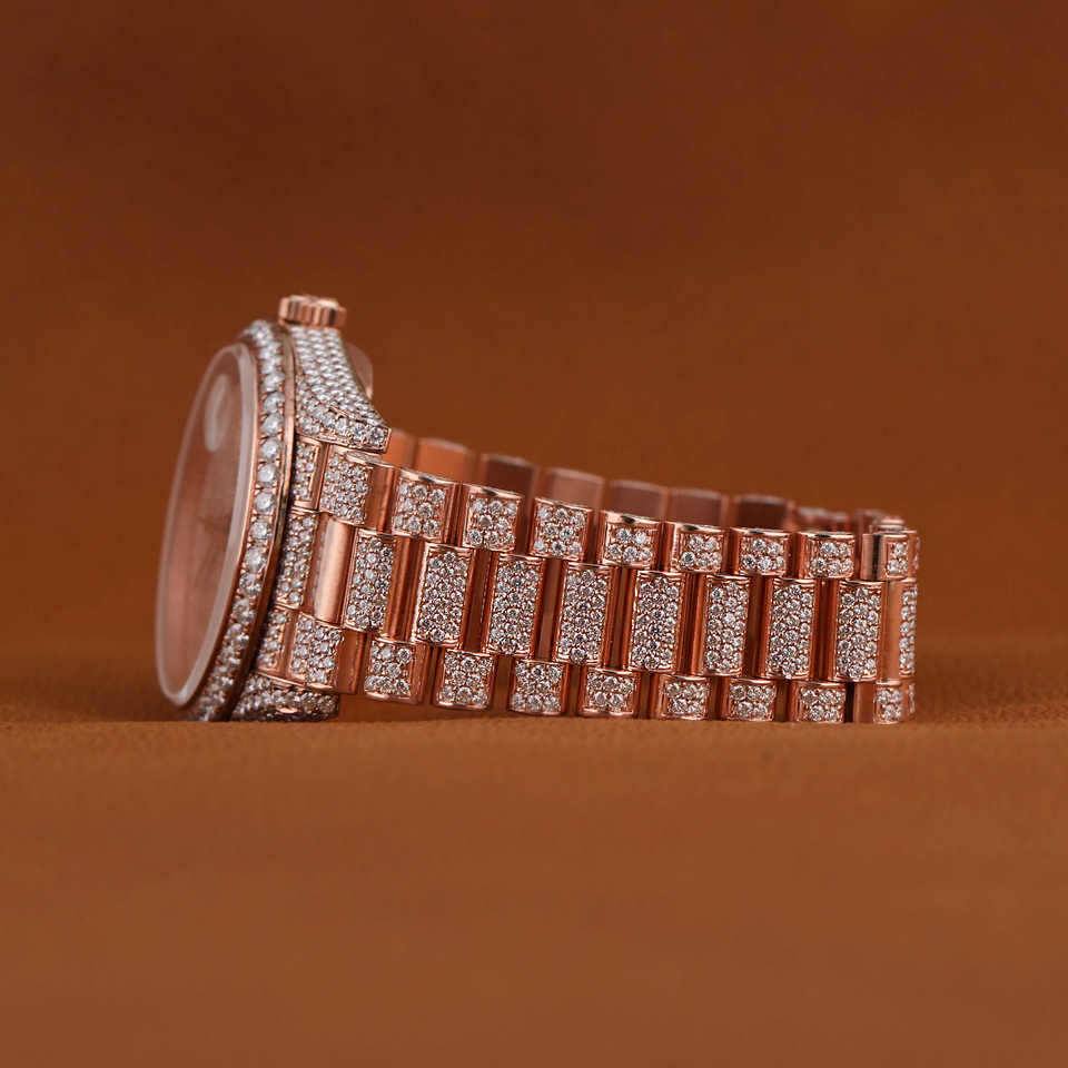 นาฬิกาหรูหราสีโรสโกลด์ประดับเพชร VVS มอยส์ซาไนต์สำหรับผู้หญิง หน้าปัดทรงกลมประดับเพชรเต็มวง สายแบบกำไล สไตล์ฮิปฮอป นาฬิกาสั่งทำพิเศษ
