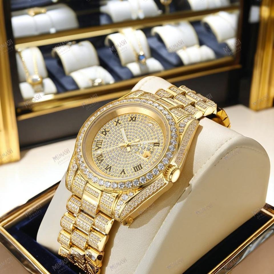นาฬิกาเพชรโมอิสสีโรสโกลด์สุดหรูพร้อมตัวเลขโรมันวันที่และสายนาฬิกาสุดหรู