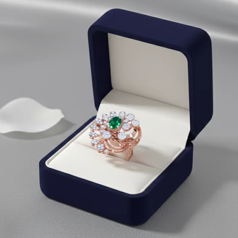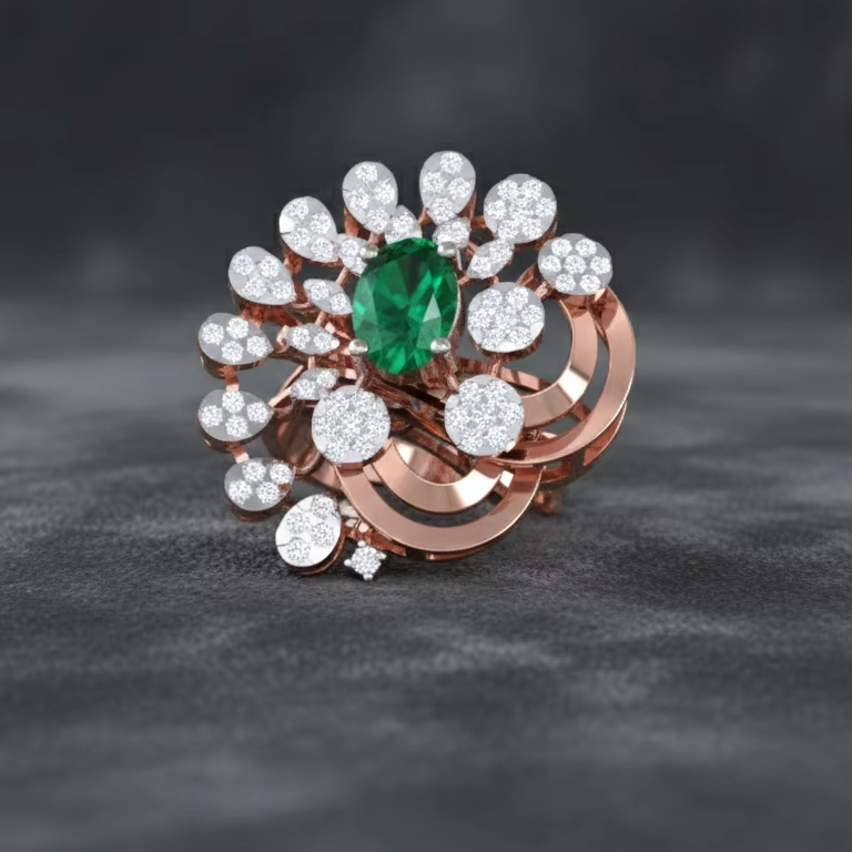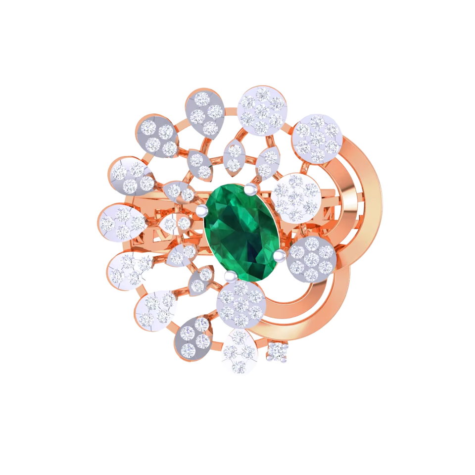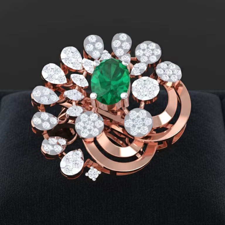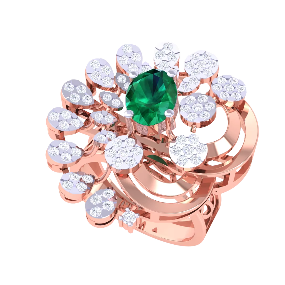 แหวนค็อกเทลรูปวงรีประดับมรกตสีเขียวและเพชรทรงดอกไม้สีโรสโกลด์สุดหรูสำหรับผู้หญิง เครื่องประดับชั้นดี ของขวัญสำหรับงานแต่งงานและงานปาร์ตี้