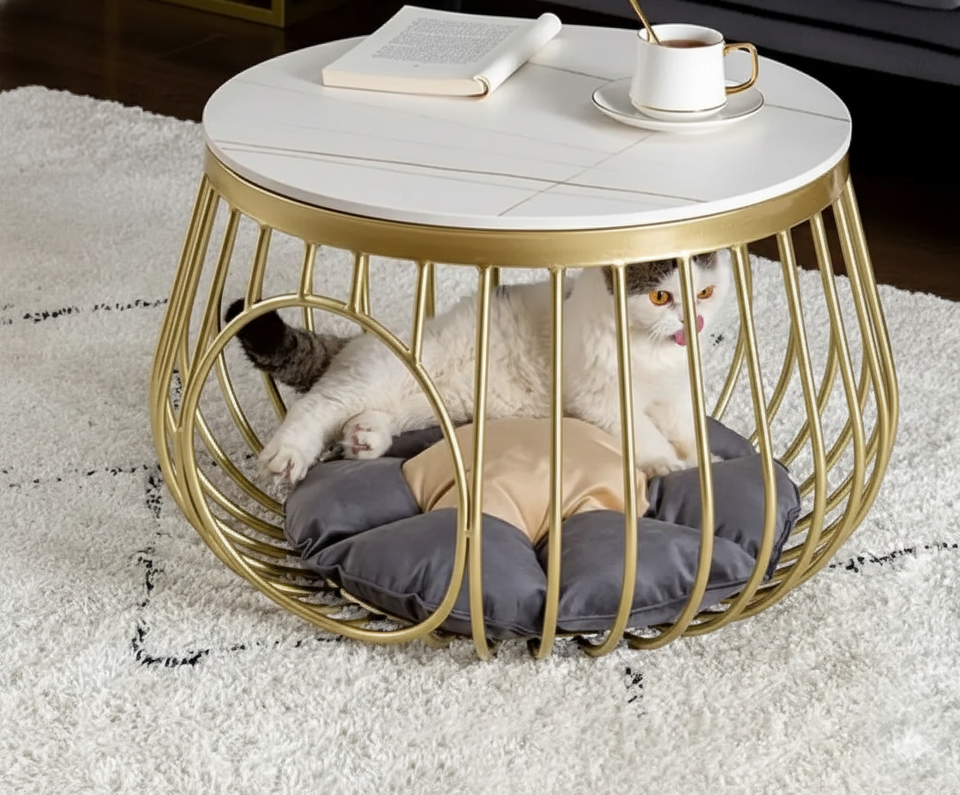 โต๊ะกาแฟทรงกลมสุดหรูพร้อมเตียงสัตว์เลี้ยงในตัว | ฐานโลหะสีทองและท็อปหินอ่อน – โต๊ะอเนกประสงค์สำหรับห้องนั่งเล่น