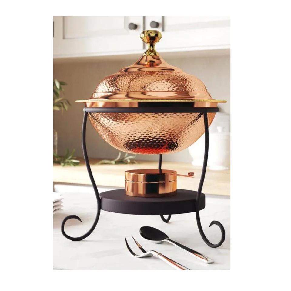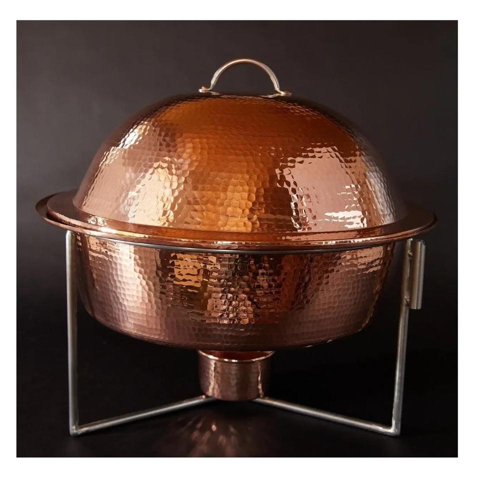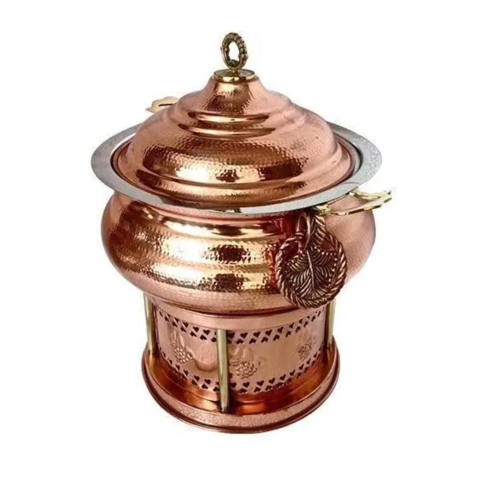 ถาดอุ่นอาหารทรงกลมทองแดงหรูหราพร้อมขาตั้งทองเหลืองแบบดั้งเดิมสำหรับโรงแรมและงานจัดเลี้ยง
