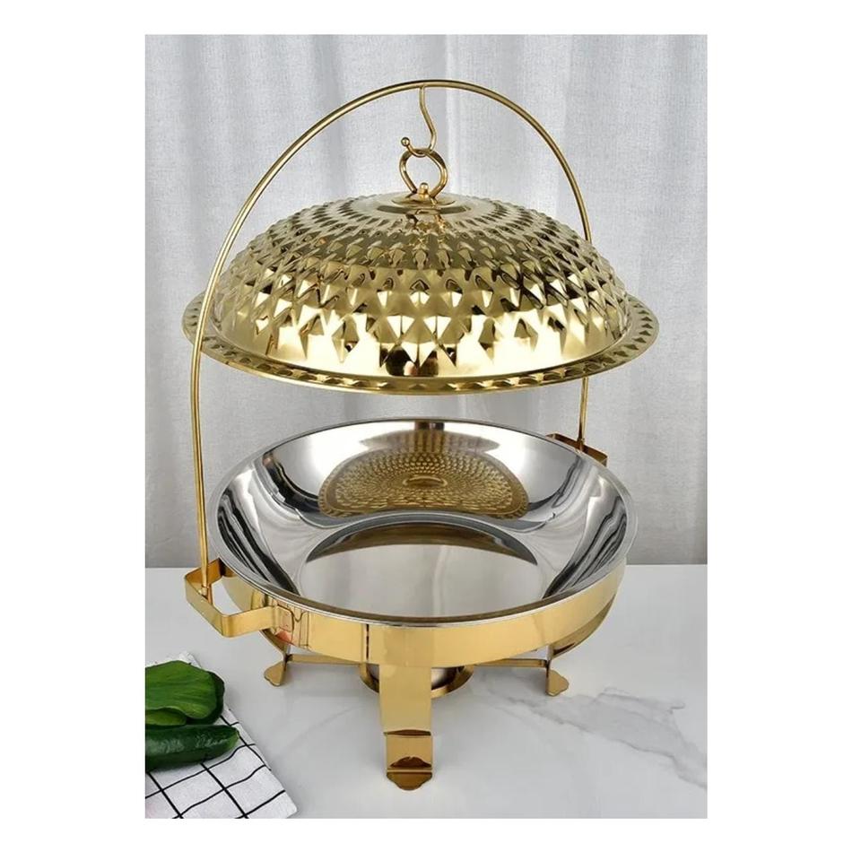 ถาดอุ่นอาหารทรงกลมหรูหรา สแตนเลสสีทอง พร้อมฝาครอบแบบแขวน สำหรับโรงแรมและงานจัดเลี้ยง