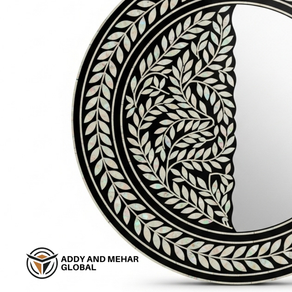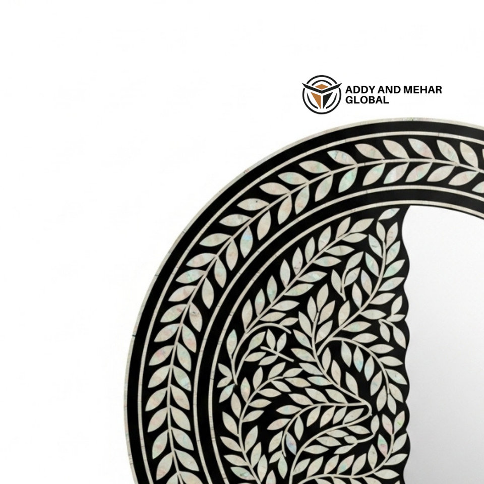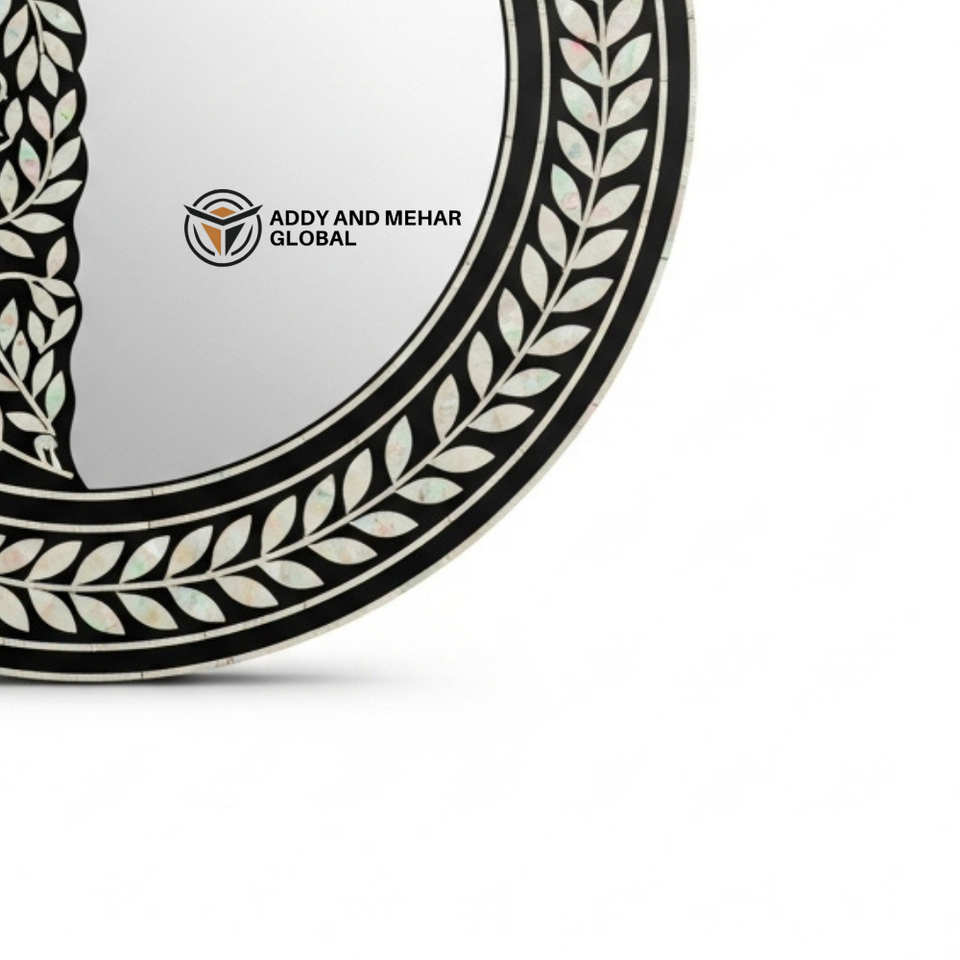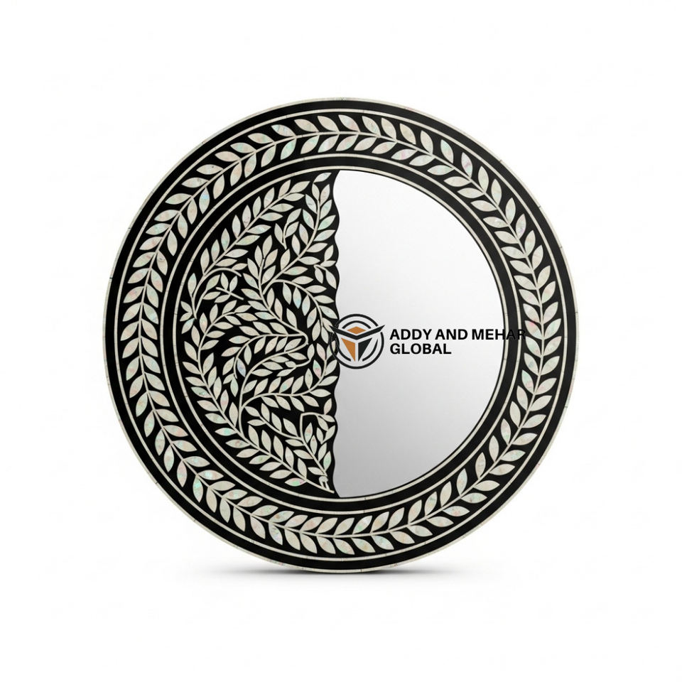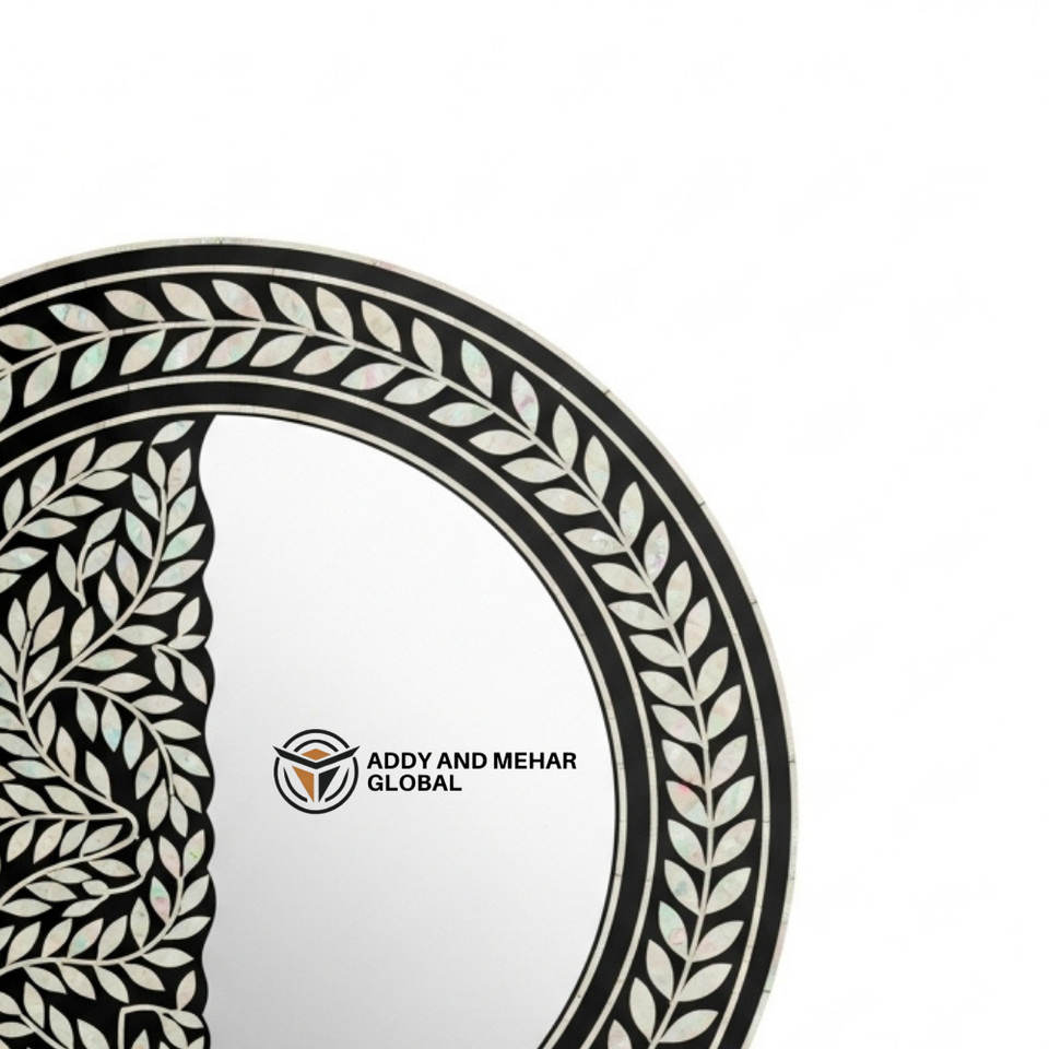 Luxury Round Mother of Pearl Inlay Handmade Shell Wall Mirror with Black Frame Art Deco Design Eco-Friendly Decorative