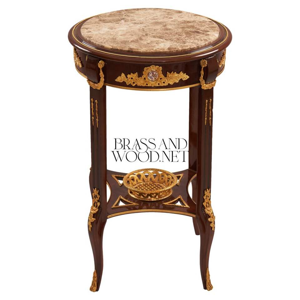 โต๊ะข้างทรงกลมหรูหราพร้อมท็อปหินอ่อนสีน้ำตาลและตกแต่งด้วยทองเหลืองลายประณีต ดีไซน์สองชั้นสำหรับตกแต่งบ้านสไตล์คลาสสิก