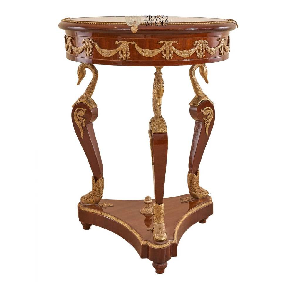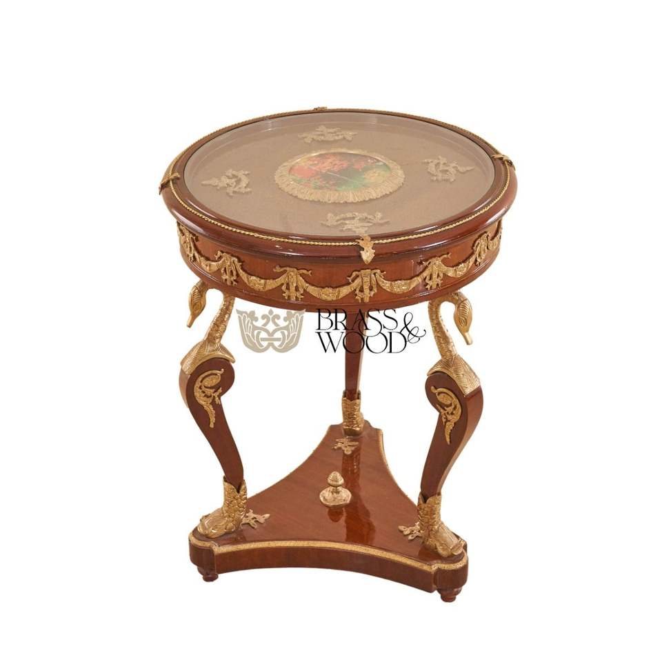 โต๊ะข้างทรงกลมหรูหราพร้อมท็อปกระจก ประดับลายศิลปะตรงกลาง และฐานรูปหงส์ทองเหลืองตกแต่งอย่างงดงาม สำหรับตกแต่งภายในพระราชวังระดับไฮเอนด์
