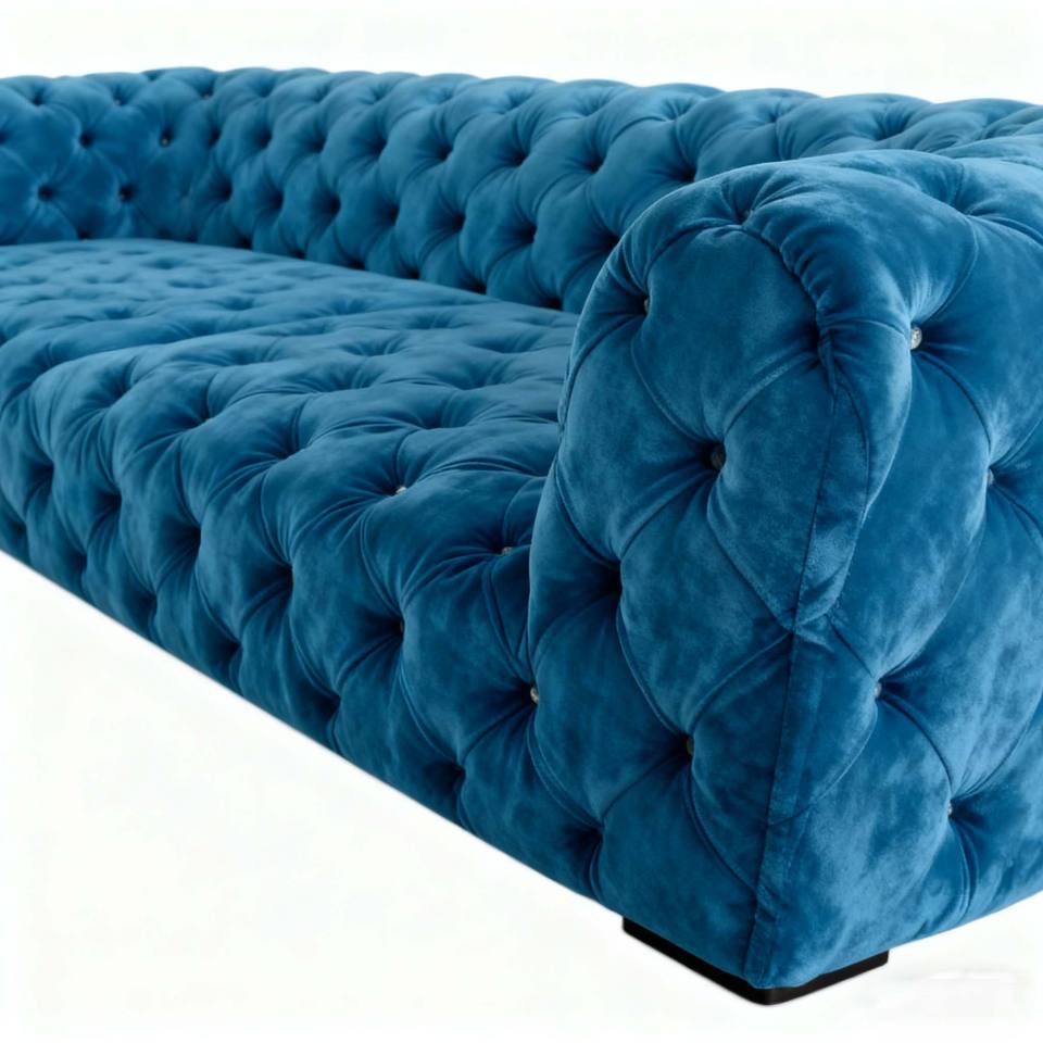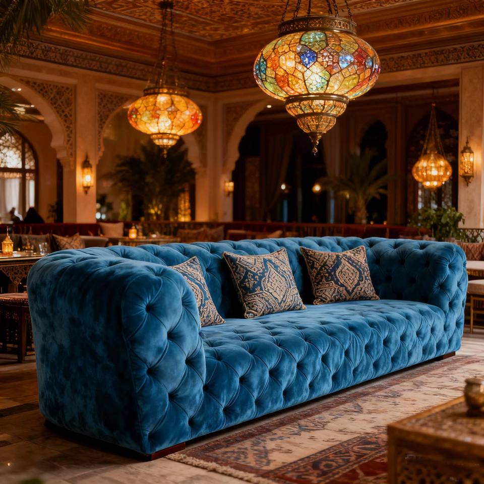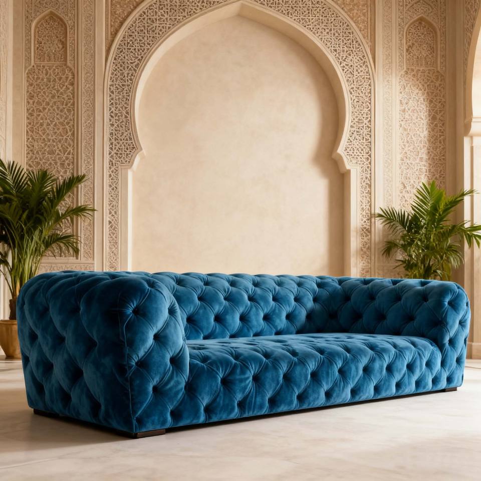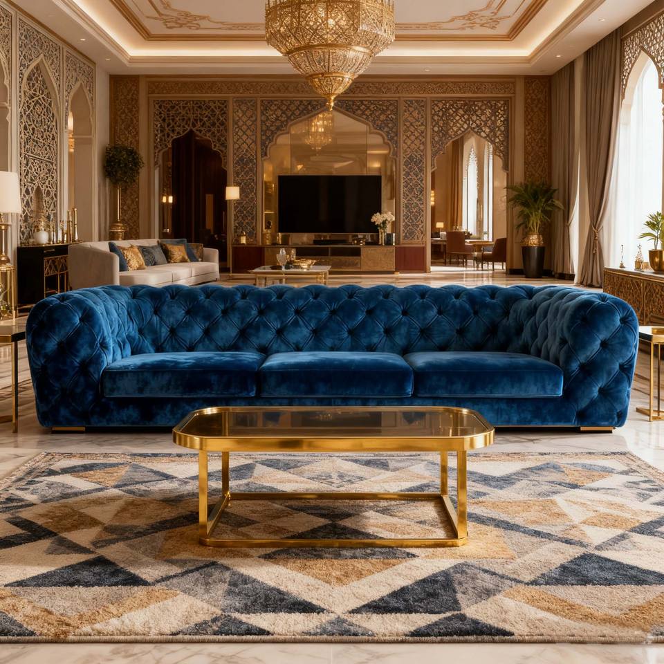 Luxury Royal Blue Velvet Tufted Three - Seater Sofa, Middle Eastern Style Gold - Accented Grand Living Room Sofa