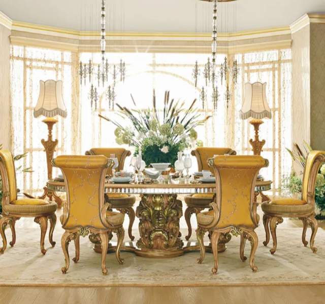 ชุดโต๊ะรับประทานอาหารรูปวงรีไม้สักแท้สีทองหรูหรา ดีไซน์ยุโรปคลาสสิก ทนทาน เป็นมิตรกับสิ่งแวดล้อม เหมาะสำหรับโรงแรม