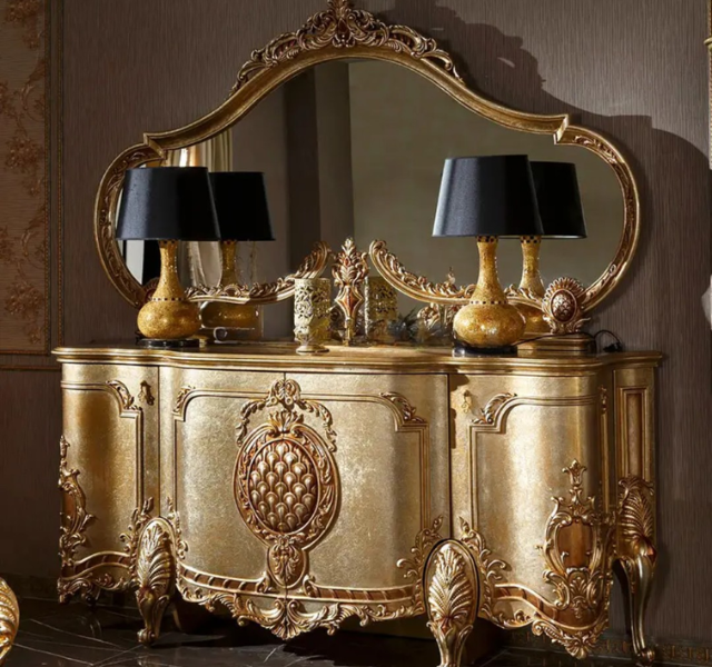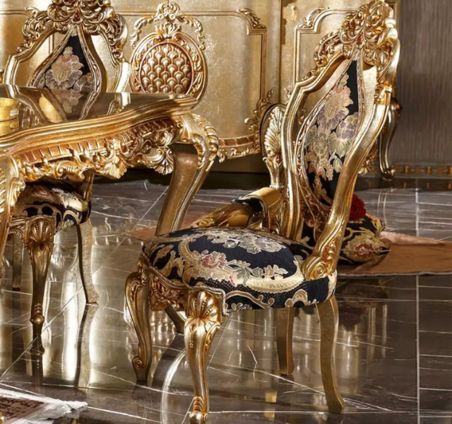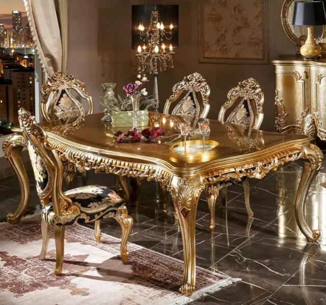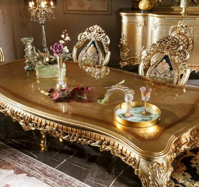 ชุดโต๊ะรับประทานอาหารไม้สักแท้แกะสลักสไตล์ยุโรปคลาสสิกสีทองหรูหราสำหรับใช้ในโรงแรม ผลิตในอินโดนีเซีย