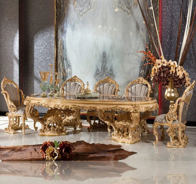 ชุดโต๊ะรับประทานอาหารรูปวงรีไม้สักทองคำหรูหราสไตล์ยุโรปคลาสสิก แกะสลักอย่างประณีต เป็นมิตรกับสิ่งแวดล้อม เหมาะสำหรับโรงแรม ผลิตในอินโดนีเซีย