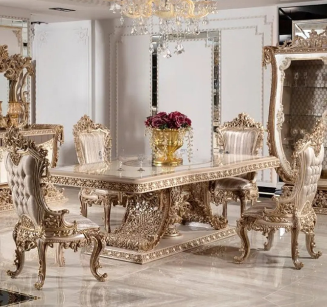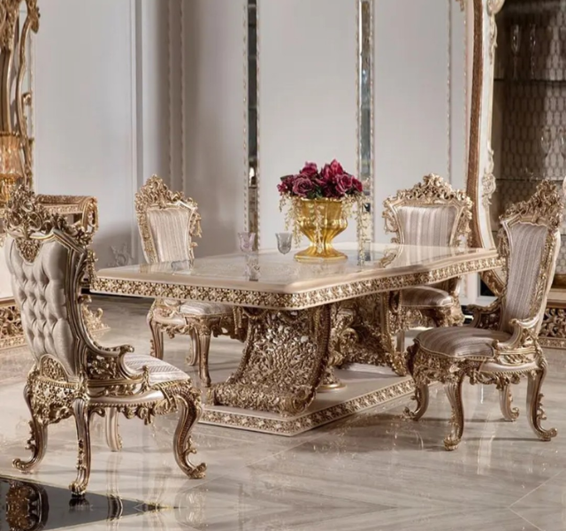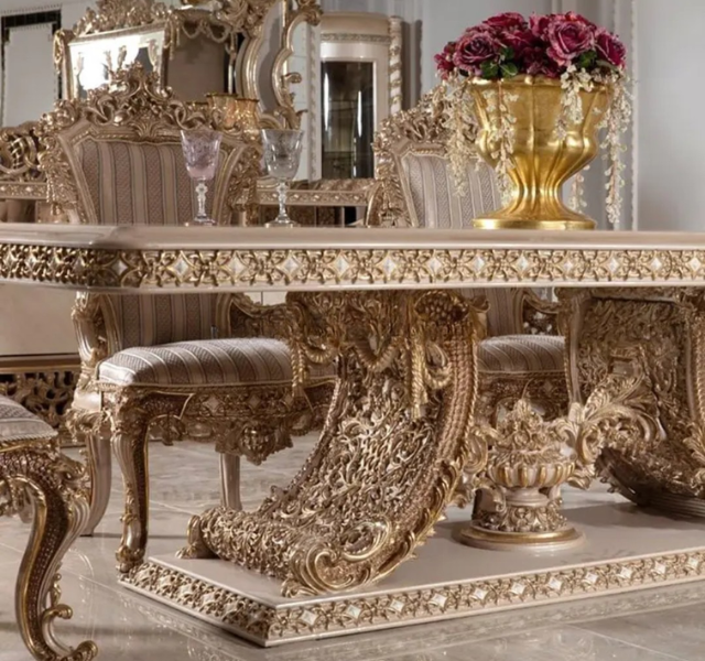 ชุดโต๊ะรับประทานอาหารไม้สักทรงสี่เหลี่ยมผืนผ้าสีทองหรูหราสไตล์ยุโรป พร้อมเฟอร์นิเจอร์แกะสลักสำหรับห้องรับประทานอาหาร ผลิตในอินโดนีเซีย