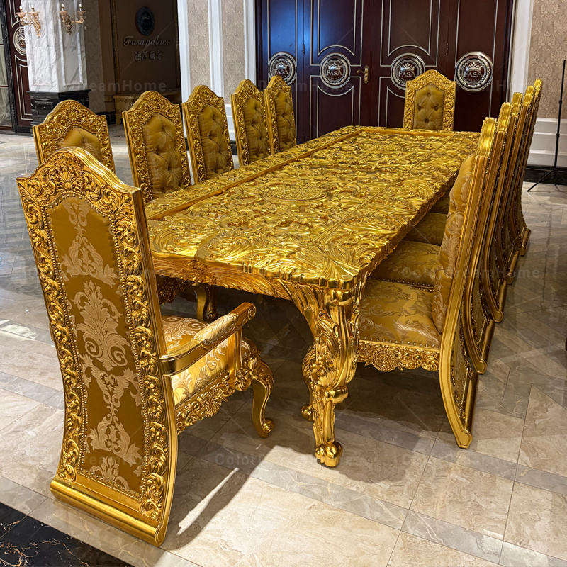 ชุดโต๊ะอาหารไม้สักแท้สุดหรู 13 ที่นั่ง แกะสลักด้วยมือ สีทอง สไตล์โมเดิร์นยุคกลาง เป็นมิตรกับสิ่งแวดล้อม สำหรับบ้านและโรงแรม