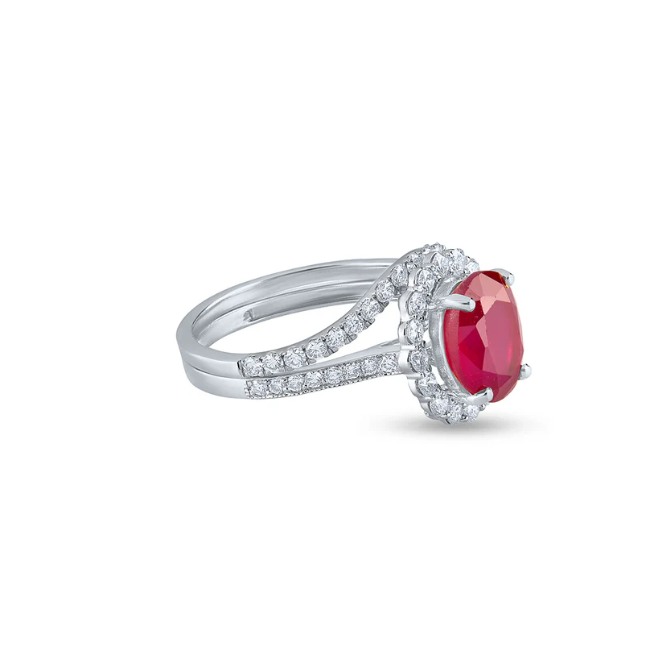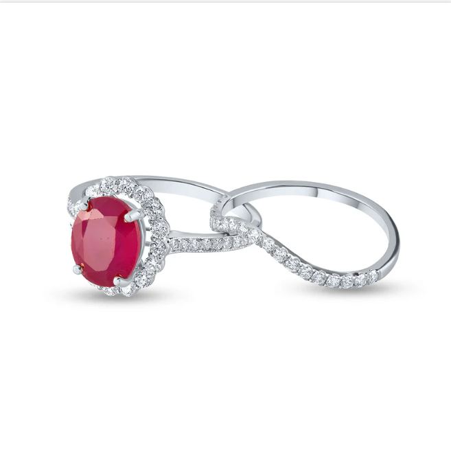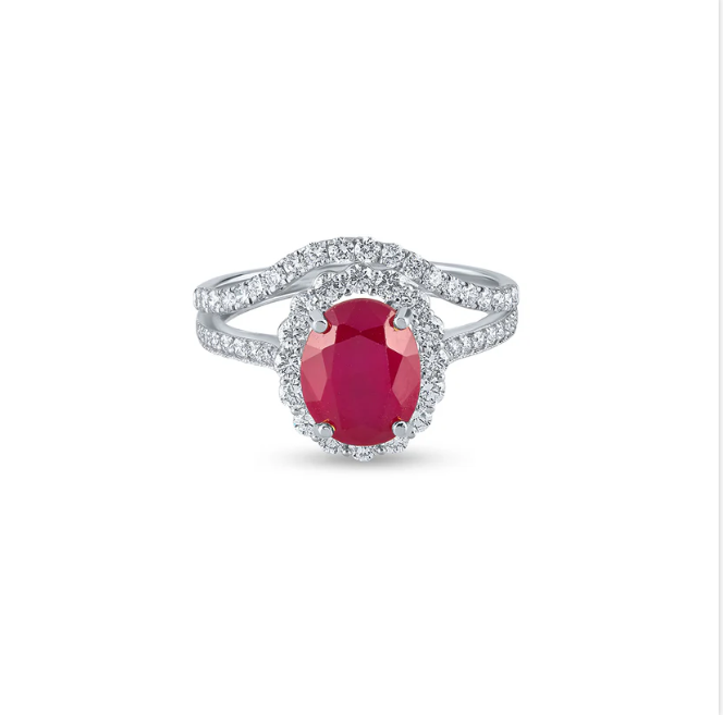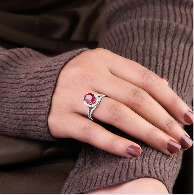 แหวนหมั้นทับทิมสุดหรูพร้อมหินศูนย์กลางรูปไข่และรัศมีเพชรสีขาวทองออกแบบมาสำหรับโอกาสพิเศษจากอินเดีย