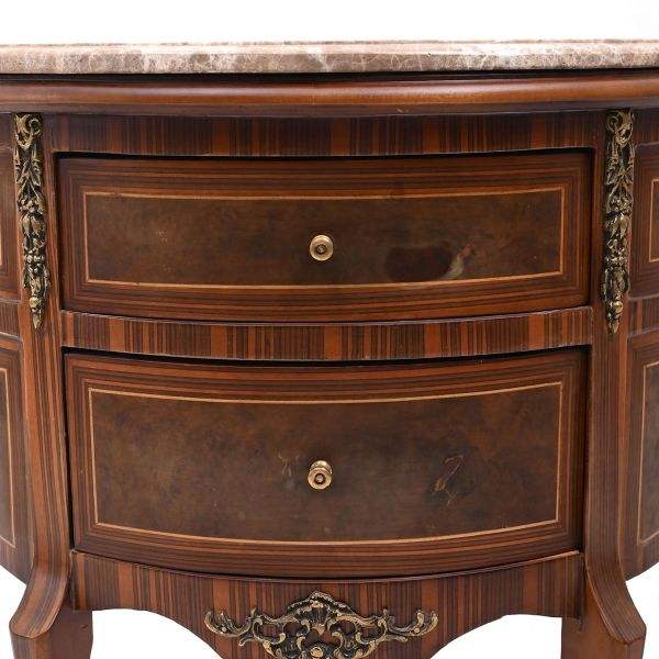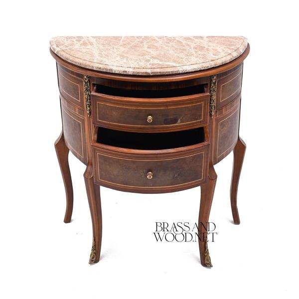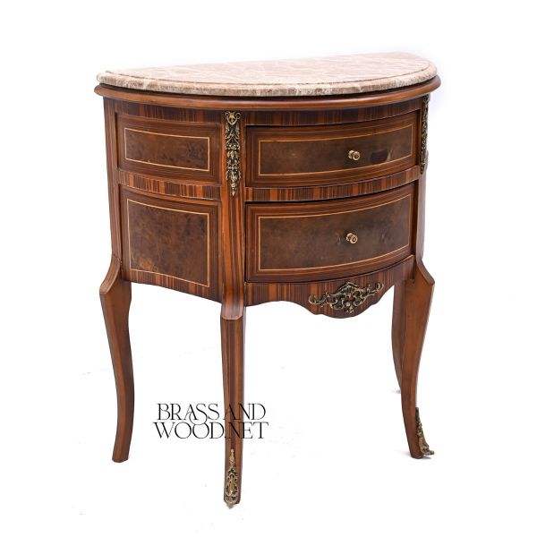 โต๊ะข้างเตียงไม้ทรงกึ่งวงรีสุดหรู พร้อมท็อปหินอ่อน ขาเรียว แต่งดีเทลทองเหลือง ดีไซน์คลาสสิกสไตล์ยุโรป