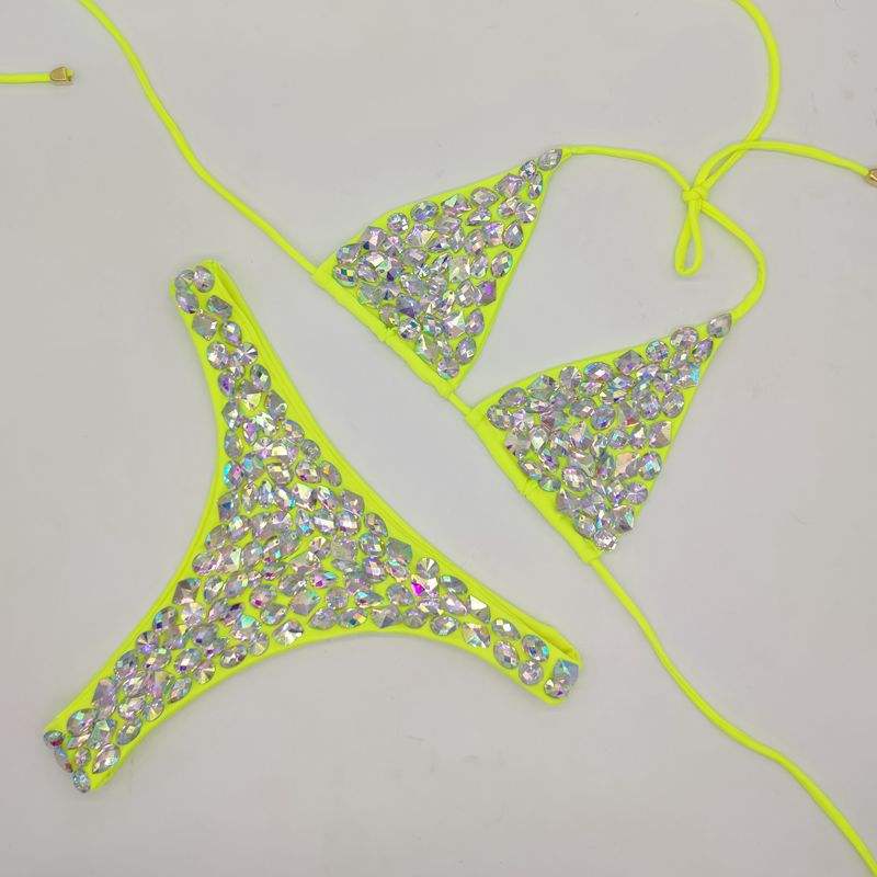 ชุดแทนกินี่บราซิลเลียนสุดหรู เซ็กซี่ คอวี ประดับคริสตัลเพชรระยิบระยับ แห้งเร็ว ระบายอากาศดี เหมาะสำหรับเต้นรำและการแสดง