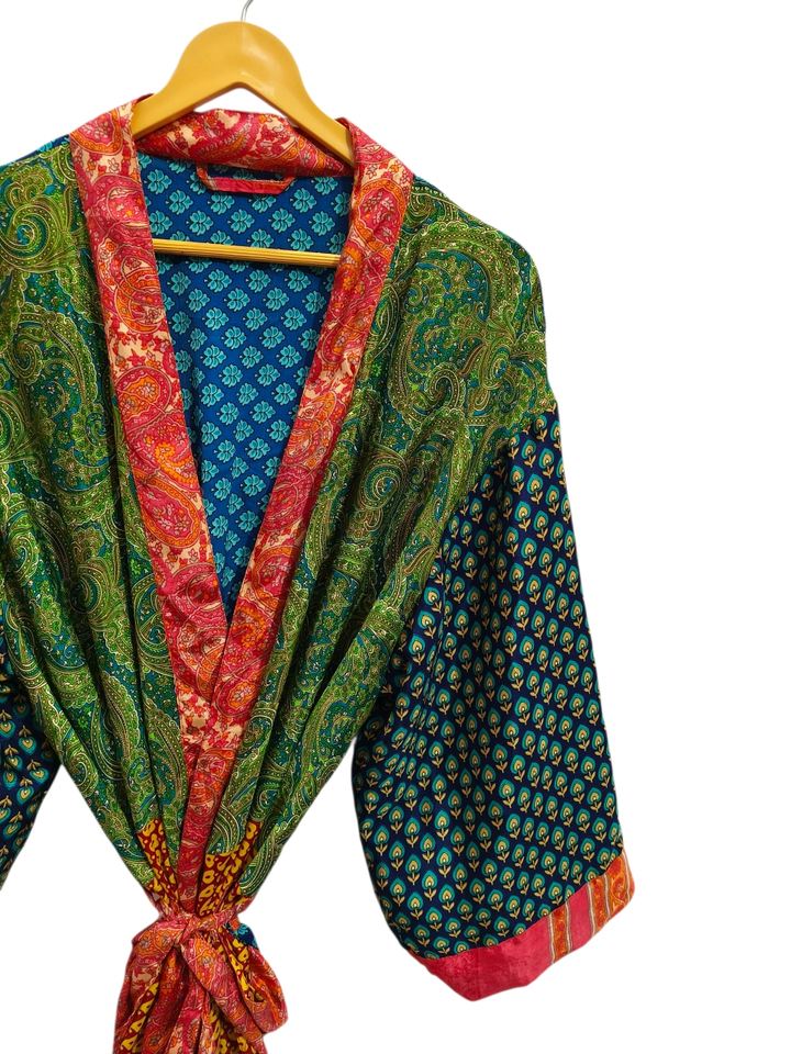 เสื้อคลุมกิโมโนผ้าไหมเย็บปะติดปะต่อกันสุดหรูผ้าคลุมบิกินี่เสื้อคลุมยาวสำหรับใส่กลางคืนทำด้วยมือสไตล์อินเดียวินเทจผ้าไหมส่าหรี