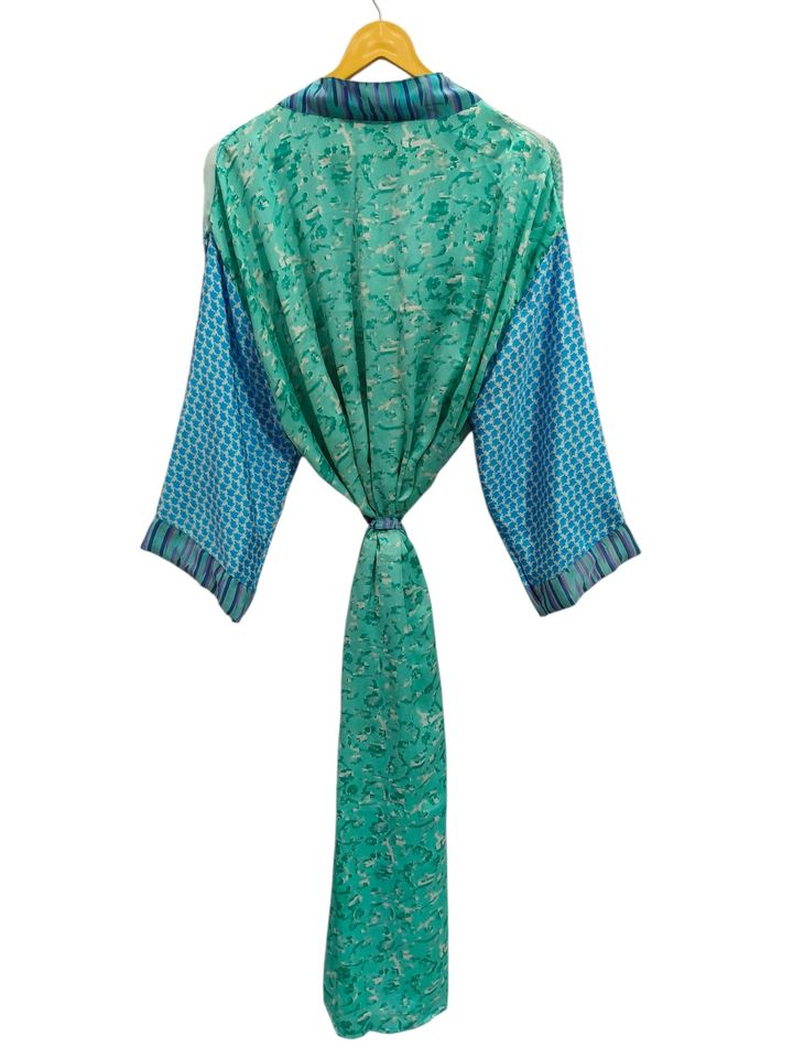 เสื้อคลุมกิโมโนผ้าไหมเย็บปะติดปะต่อกันสุดหรูผ้าคลุมบิกินี่เสื้อคลุมยาวสำหรับใส่กลางคืนทำด้วยมือสไตล์อินเดียวินเทจผ้าไหมส่าหรี