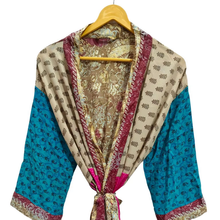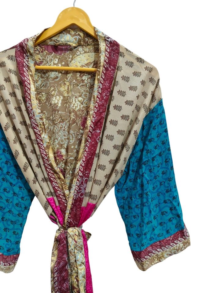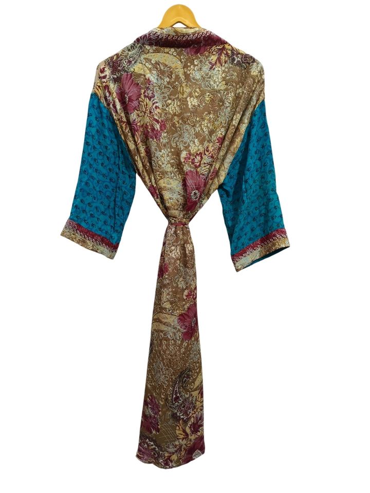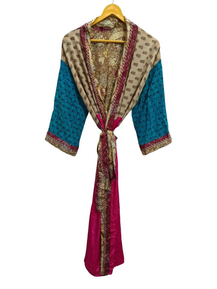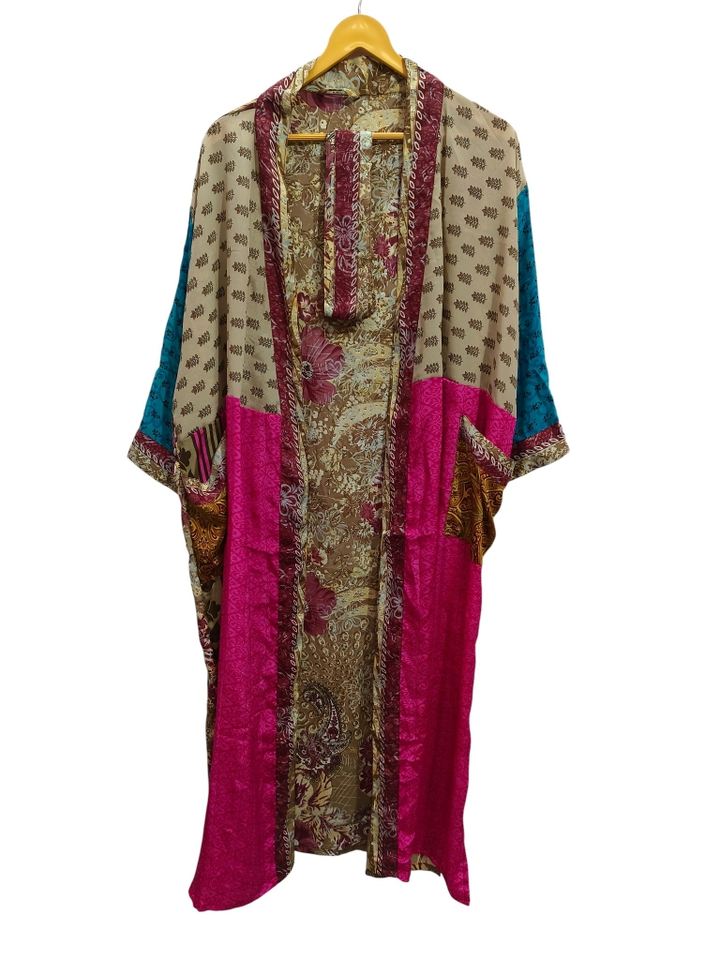 ชุดคลุมกิโมโนผ้าไหมหรูหราแบบปะติดปะต่อ ใช้คลุมบิกินี่หรือใส่นอน ชุดคลุมยาว ทำด้วยมือจากผ้าไหมซารีอินเดียวินเทจรีไซเคิล