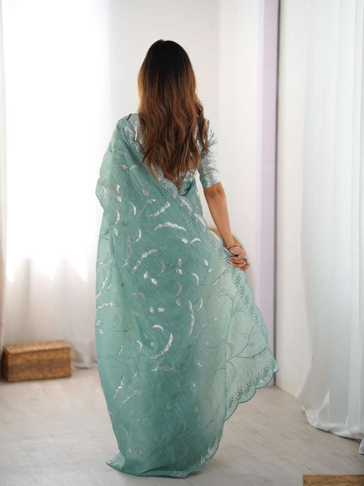 ส่าหรีประดับเลื่อมสีเงินสุดหรูสำหรับงานแต่งงานและงานปาร์ตี้ทั้งสองด้าน