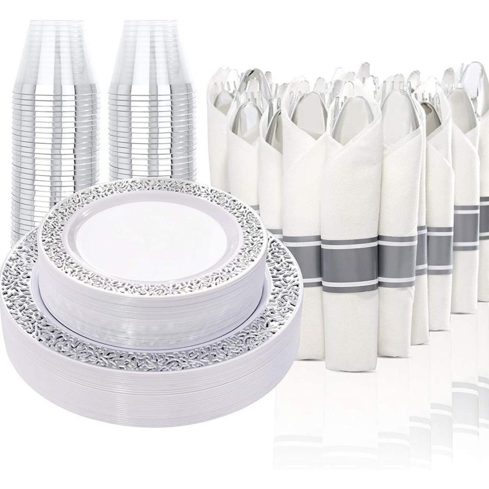 ชุดจานพลาสติกแข็งใสขอบเงินหรูหราแบบใช้แล้วทิ้ง 175 ชิ้น สำหรับงานปาร์ตี้และงานแต่งงาน ขนาด 7.5 นิ้ว และ 10.25 นิ้ว