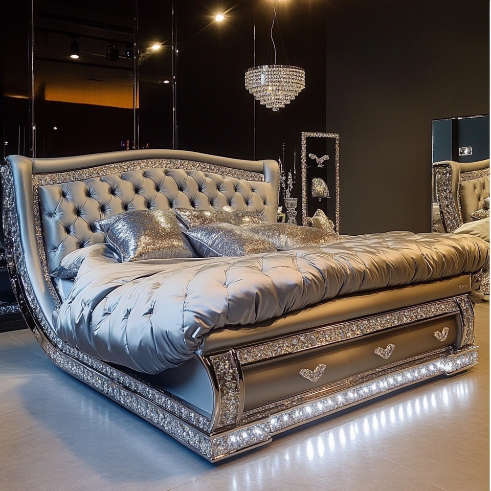เตียงนอนขนาดคิงไซส์ ดีไซน์ทันสมัย โครงสีเงินหรูหรา หุ้มด้วยผ้าบุอย่างดี พร้อมกระจกและฟังก์ชั่นนวด ผลิตจากวัสดุที่เป็นมิตรต่อสิ่งแวดล้อม เหมาะสำหรับโรงแรม