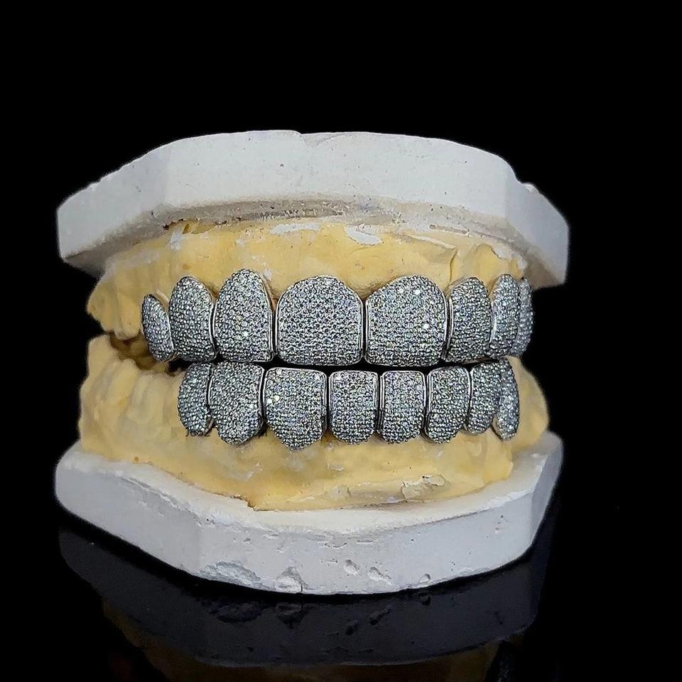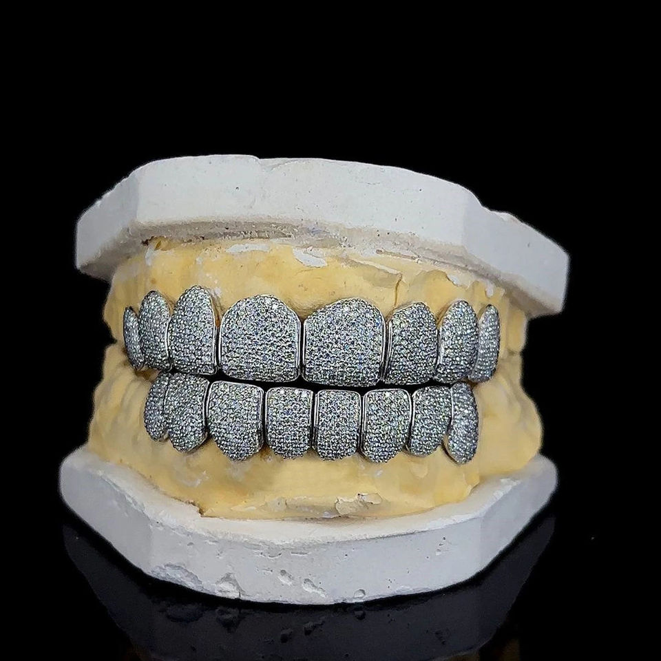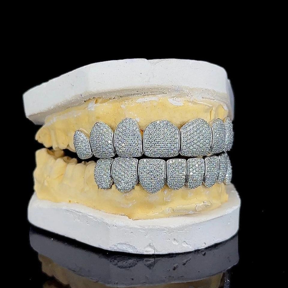 กริลล์ซ์เงินหรูหราประดับเพชรโมอิสซาไนต์แบบไมโครเพฟ ชุดเครื่องประดับสำหรับฟันบนและล่าง สไตล์ฮิปฮอป ของขวัญสุดพิเศษ