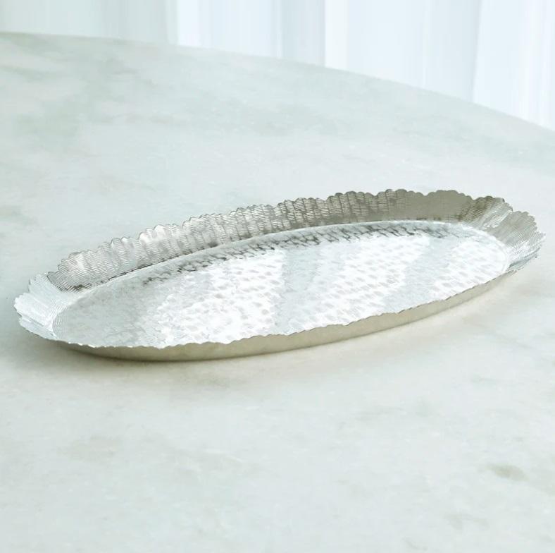 ถาดรองจานอลูมิเนียมทรงรีสีเงินสุดหรูพร้อมขอบหยักสำหรับตกแต่งโรงแรมจานเสิร์ฟขนม