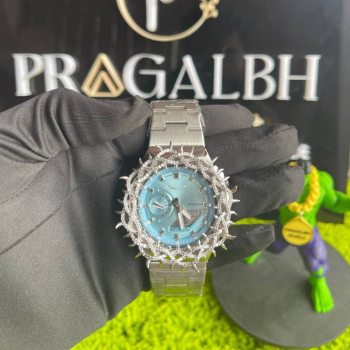 นาฬิกาควอตซ์หรูหราประดับเพชรสำหรับผู้ชาย สายสแตนเลส หน้าปัดสีน้ำเงิน กันน้ำ แฟชั่นฮิปฮอป